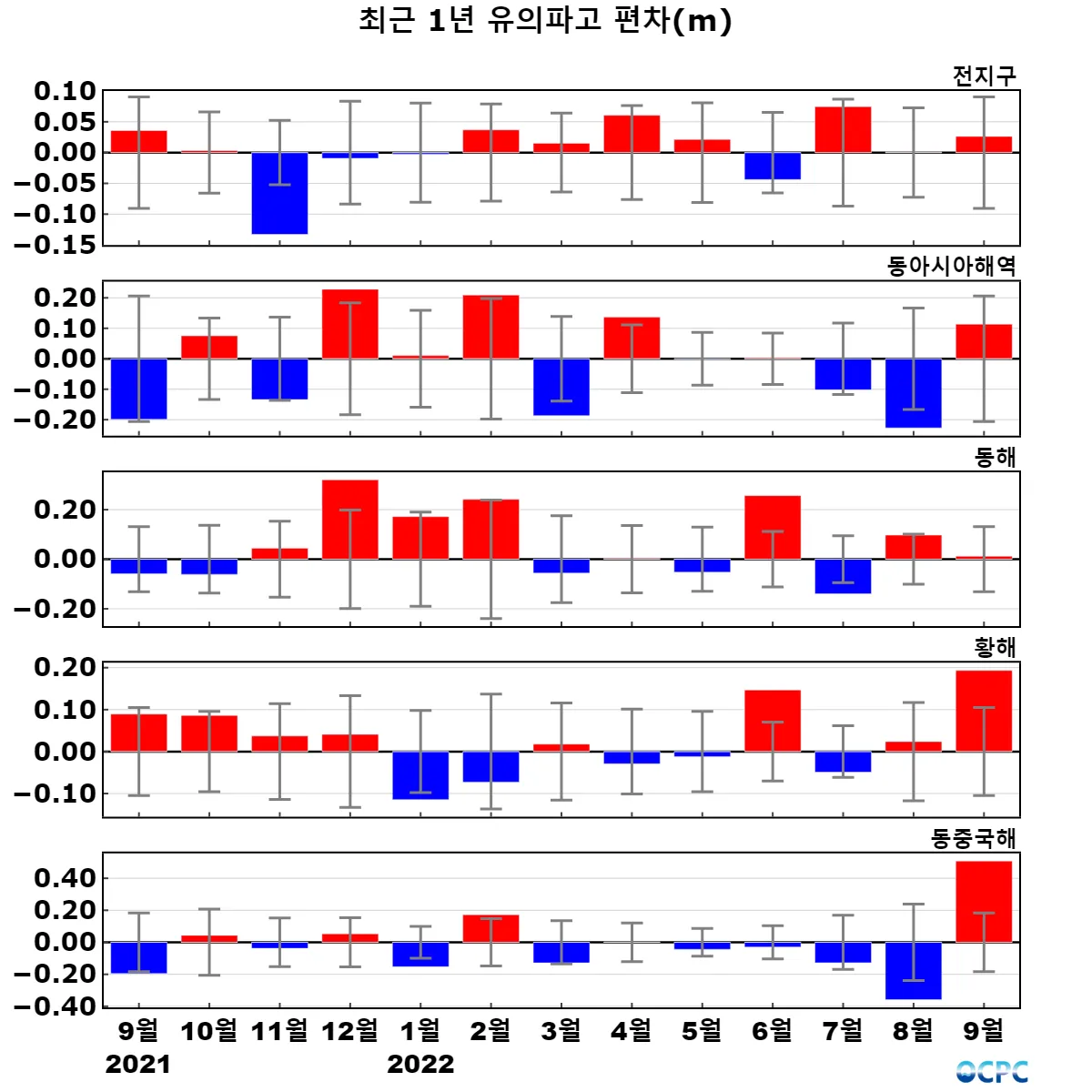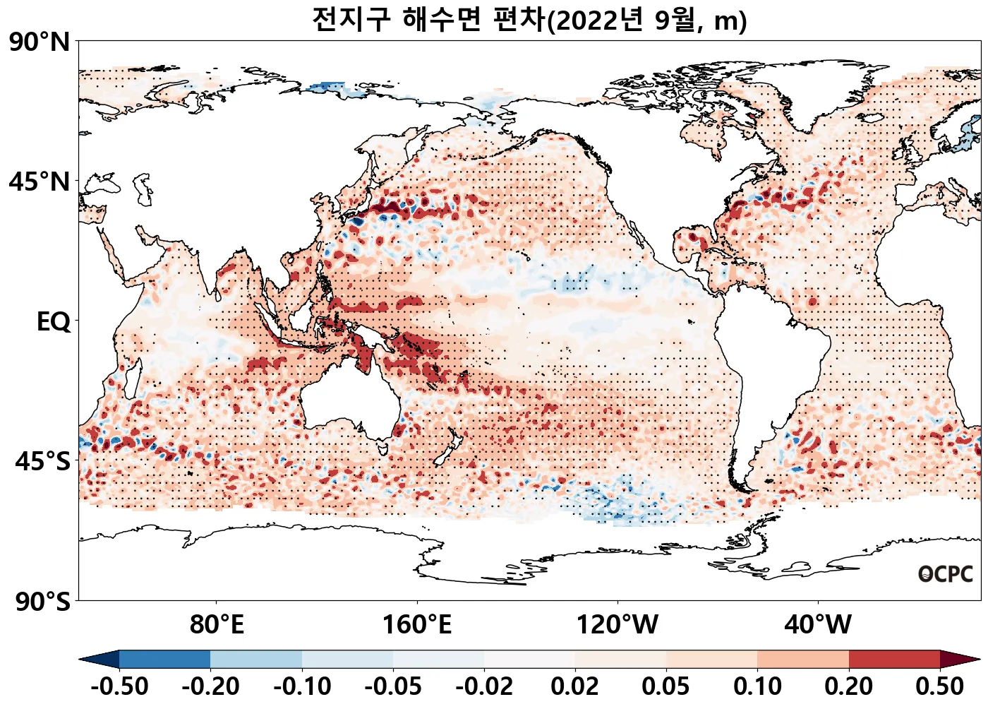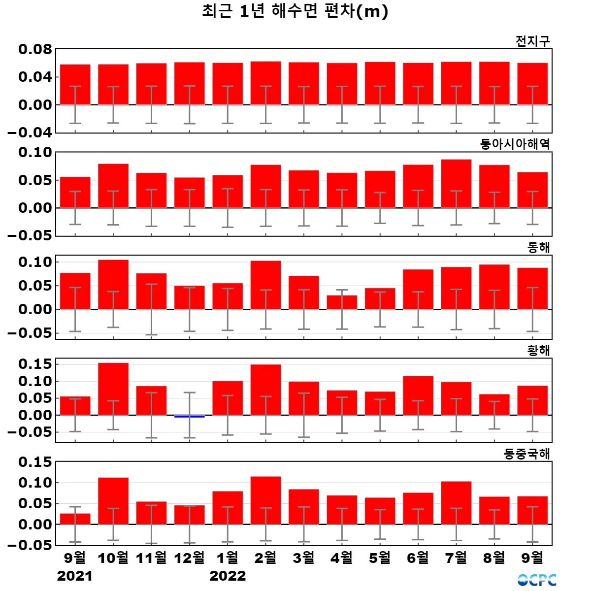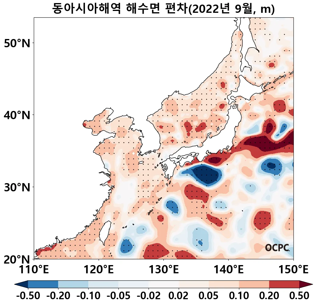 [해수면] 전지구, 동아시아해역, 동해, 황해, 동중국해의 해수면은 평년보다 6.0~8.8cm 높았으며, 전지구, 동해, 황해, 동중국해는 1993~2022년(9월) 중 가장 높았습니다. (동아시아해역도 역대 2위)