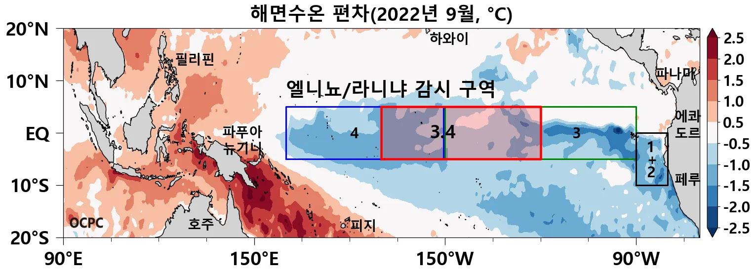 2022년 9월 평균 해면수온의 평년 대비 편차 (숫자가 표시된 사각형은 엘니뇨/라니냐 감시구역으로 각각 Nino1+2, Nino3, Nino4, Nino3.4 해역이며, ONI 지수는 Nino3.4 구역을 기준으로 합니다.)