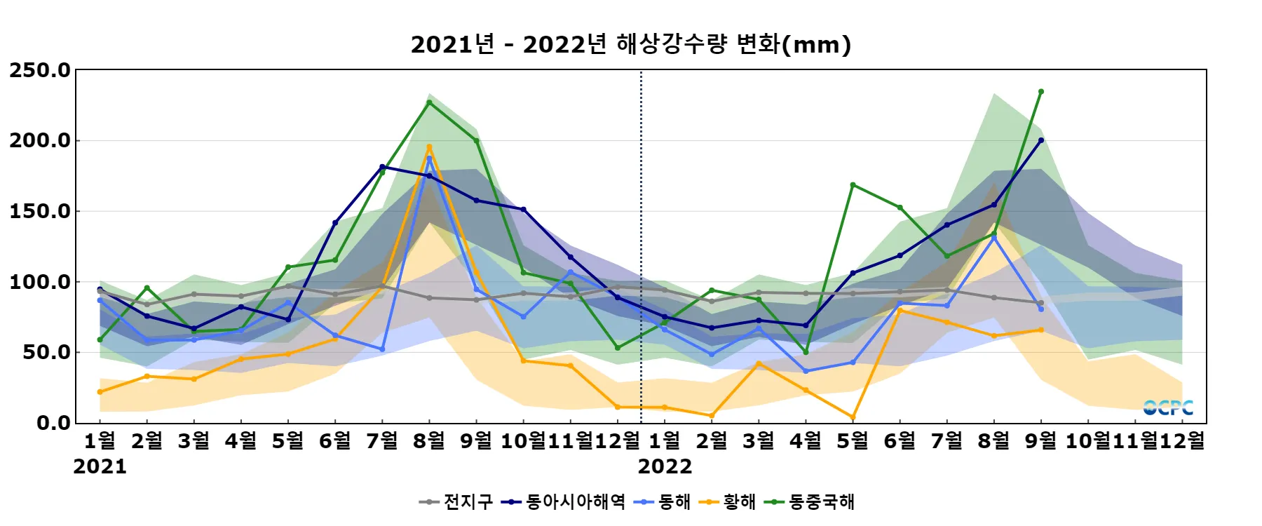 동해, 황해의 해상강수량은 평년(95.7mm, 59.9mm)과 비슷했으며, 동중국해는 평년(153.7mm)보다 81.2mm(52.8%) 많았습니다.