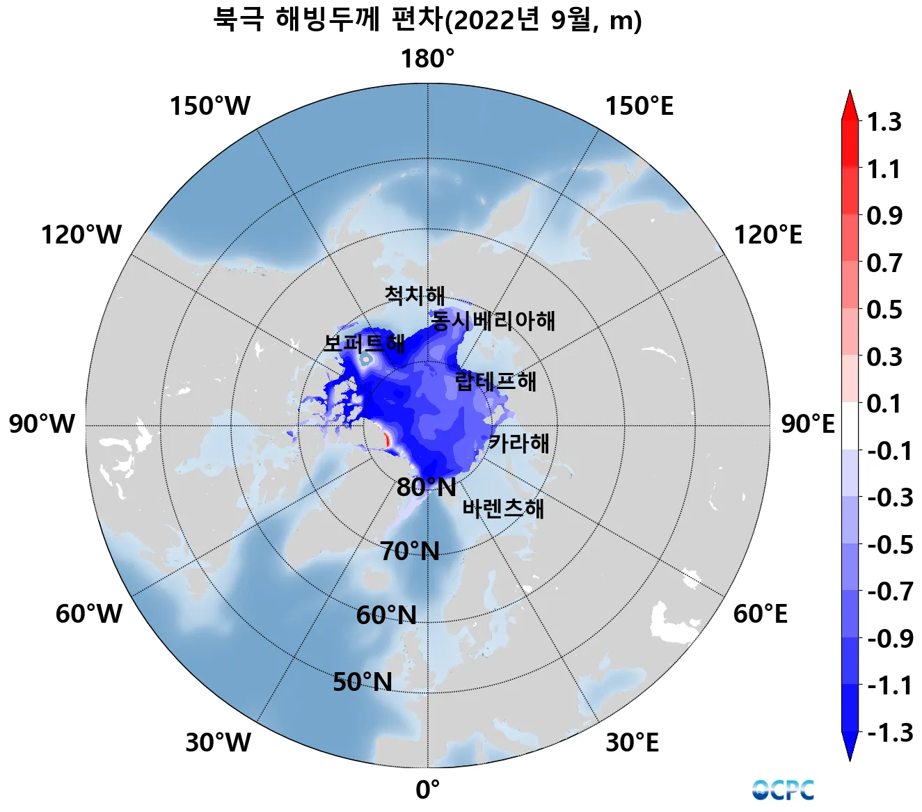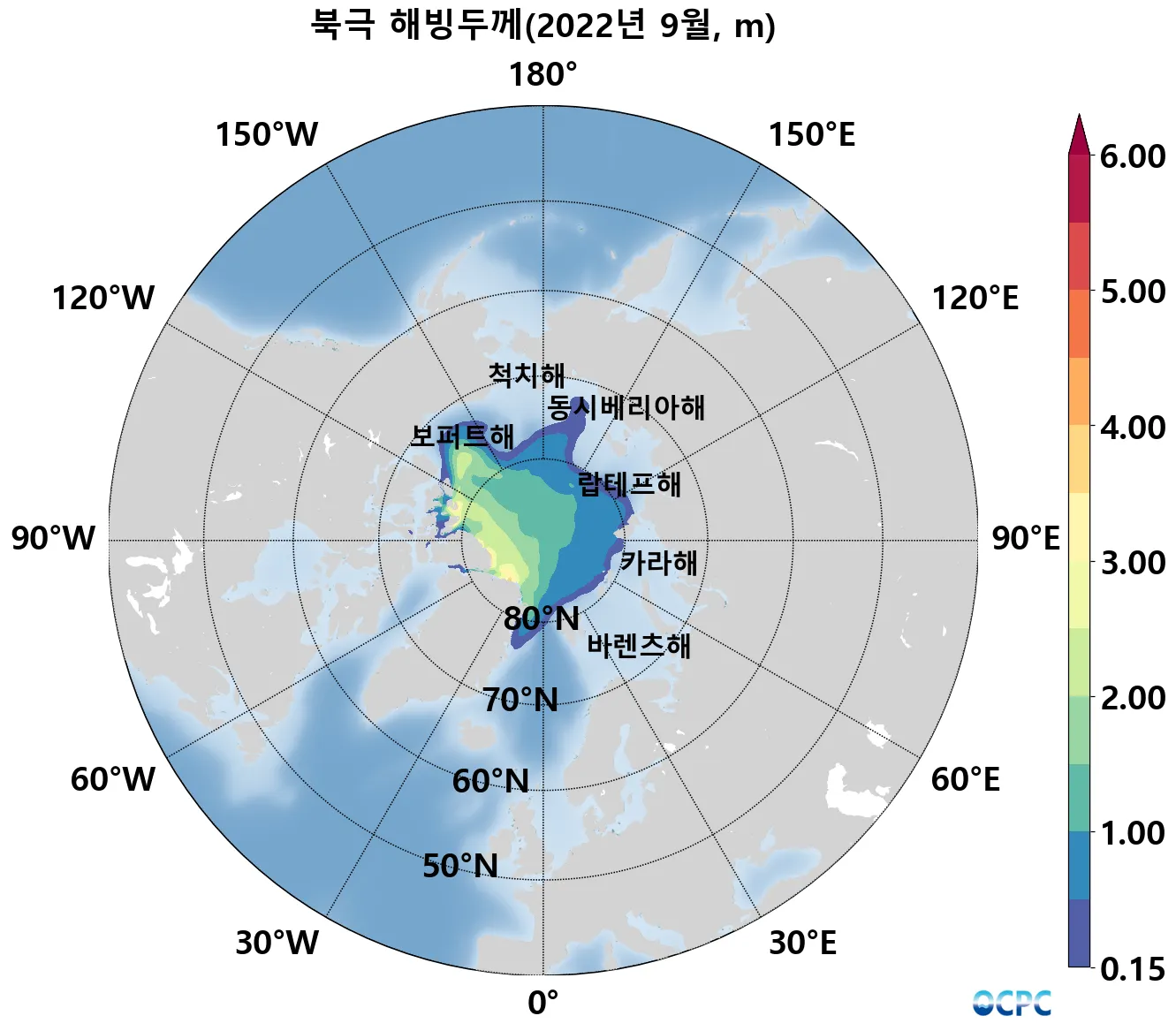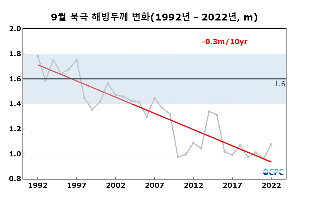 북극 해빙두께는 평년(약 1.6m)보다 약 0.5m(32.5%) 얇았으며, 최근 30년 동안 10년에 약 0.3m씩 얇아지는 추세입니다.