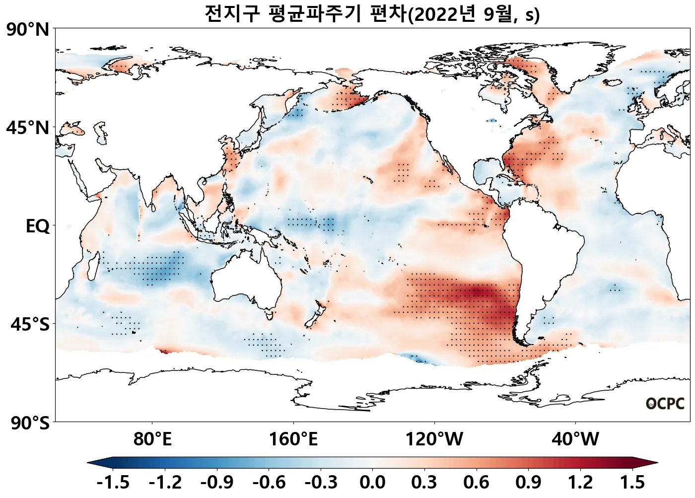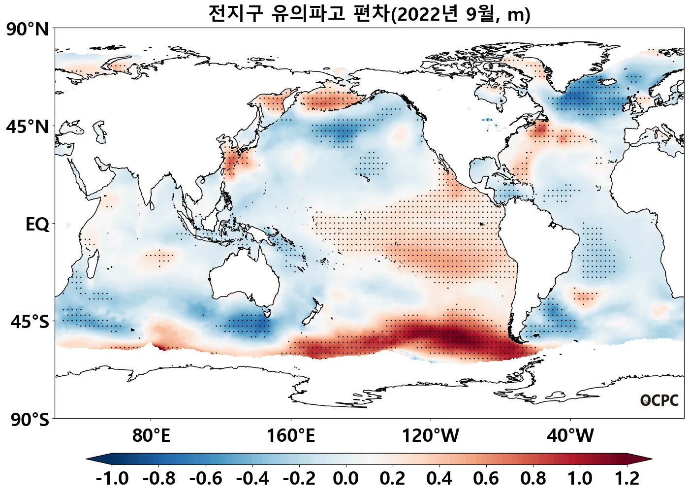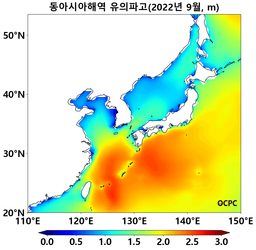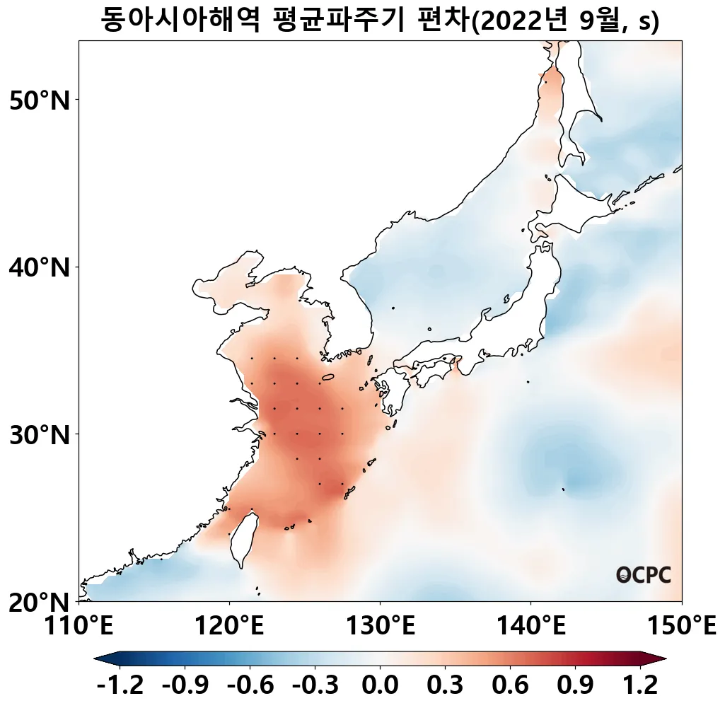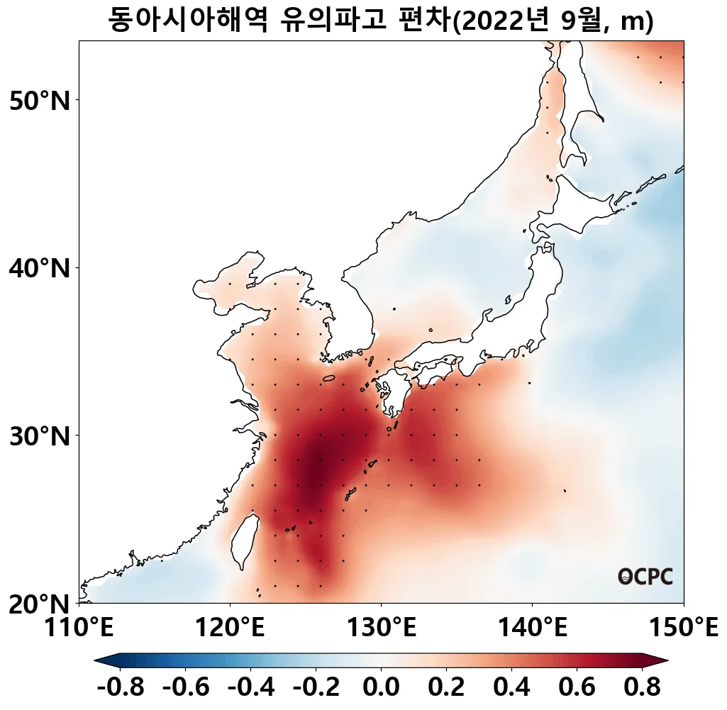 동중국해의 평균 유의파고는 평년(1.4m)보다 0.5m 증가했고, 1992~2022년(9월) 중 가장 높았습니다.