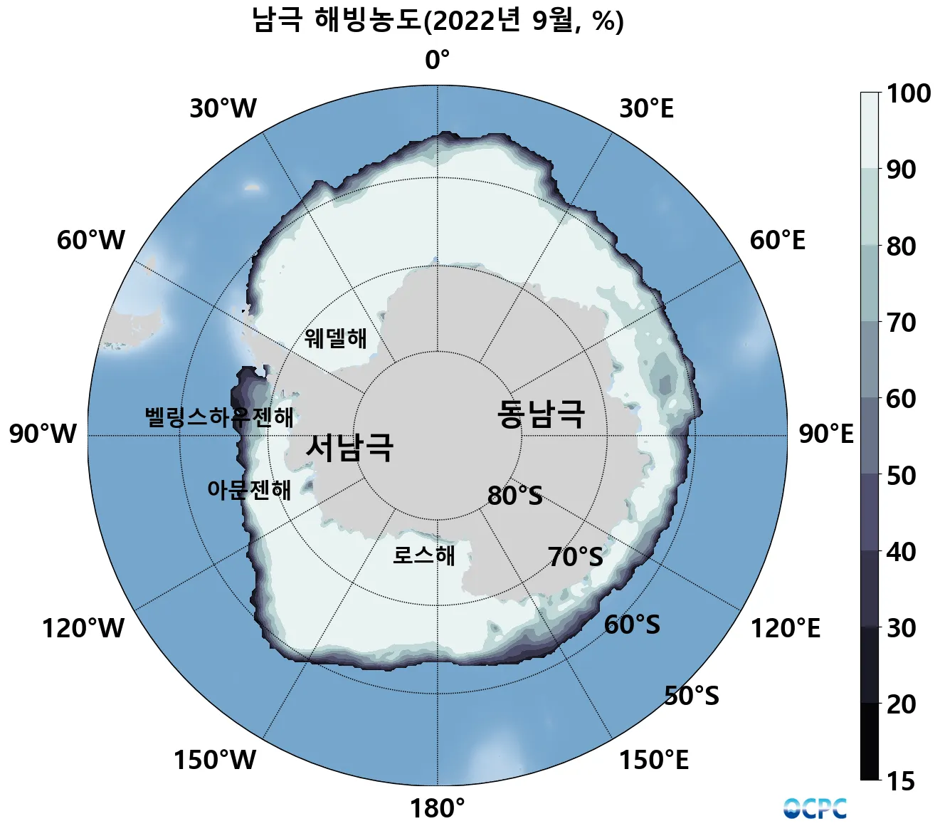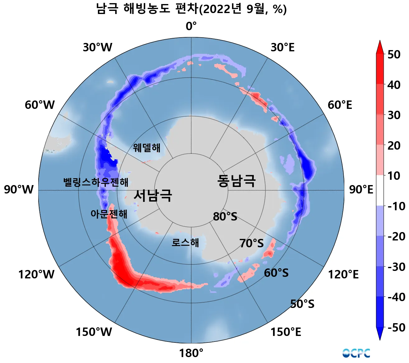로스해-서아문젠해 외해역에서 평년대비 해빙면적이 증가했고, 벨링스하우젠해, 웨델해와 동남극 인도양 인접 해역(60°E~120°E)에서 감소했습니다.