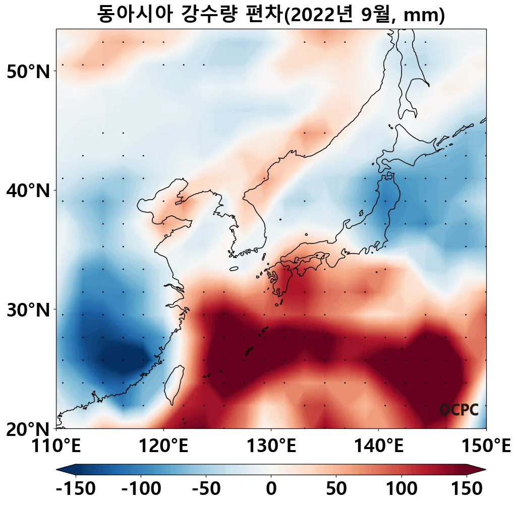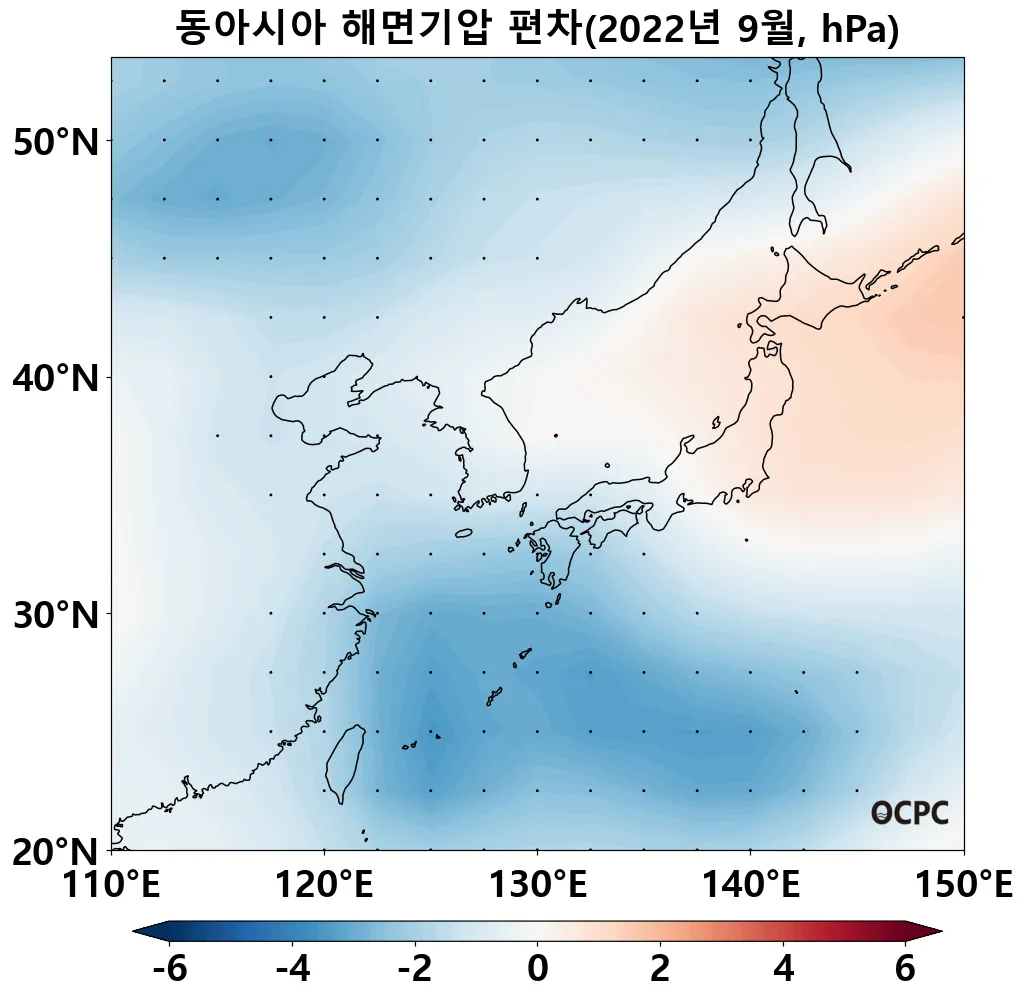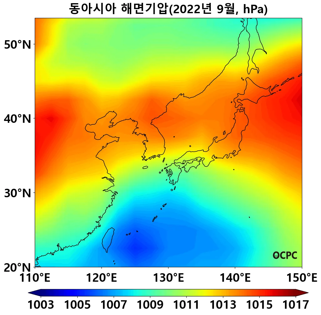 한편 동중국해는(1011.2hPa)보다 2.6hPa 낮아 1981~2022년(9월) 중 가장 낮았습니다.