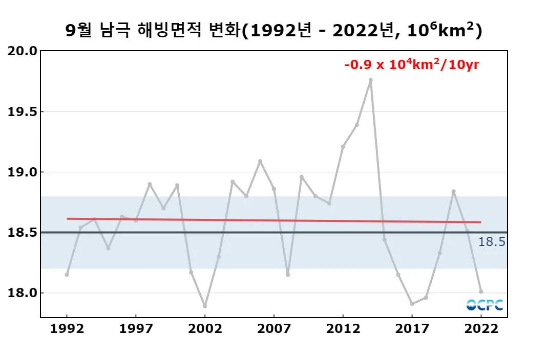 1992~2022년 동안 9월 남극 해빙면적은 10년에 9천km²씩 감소하는 추세입니다.