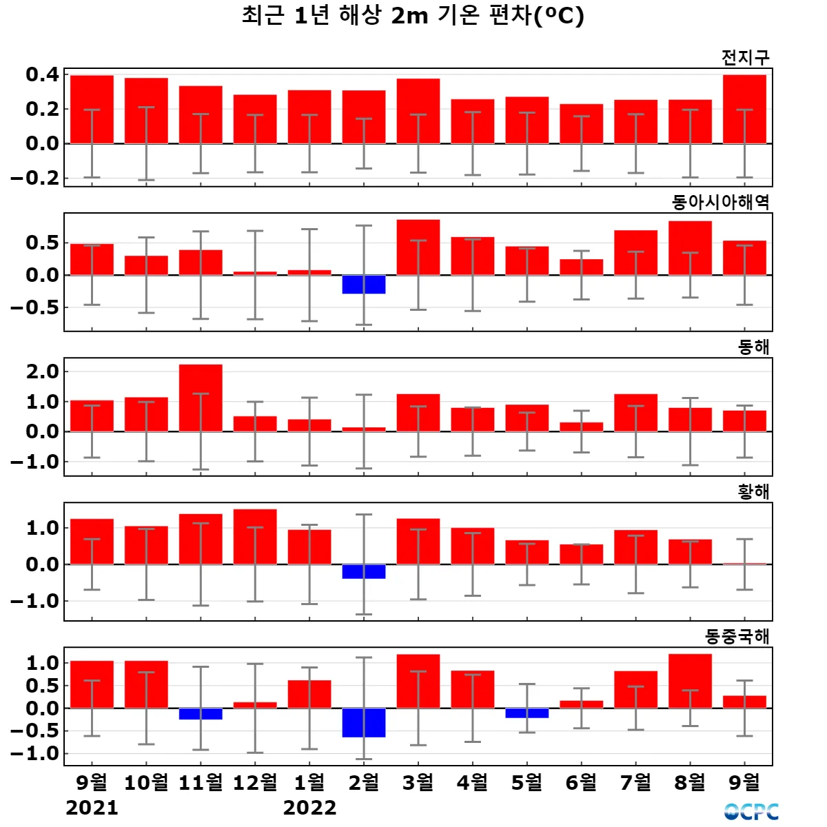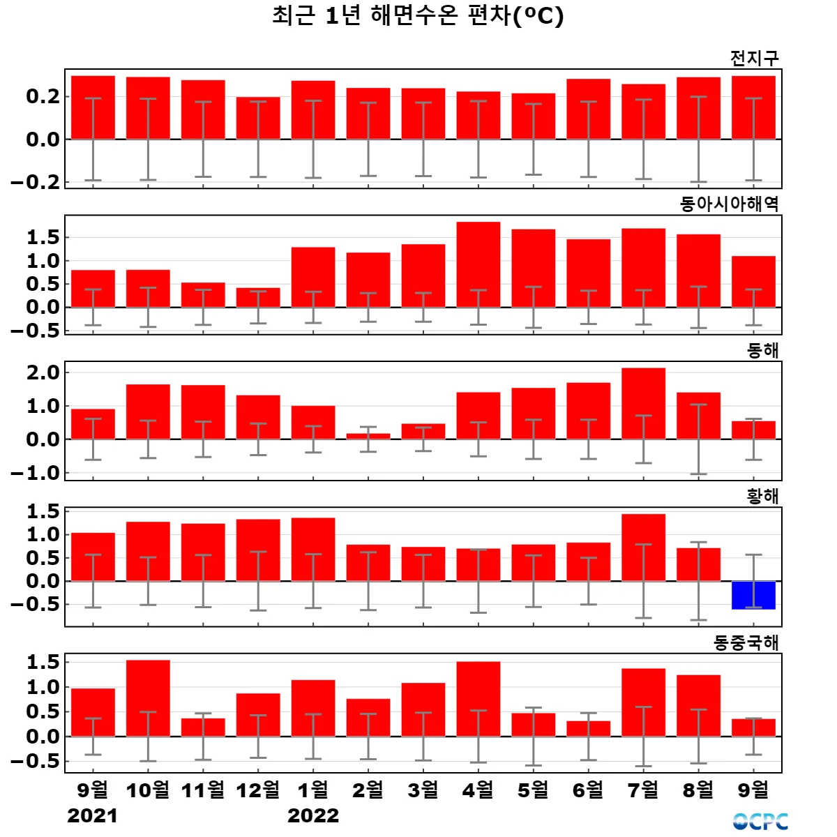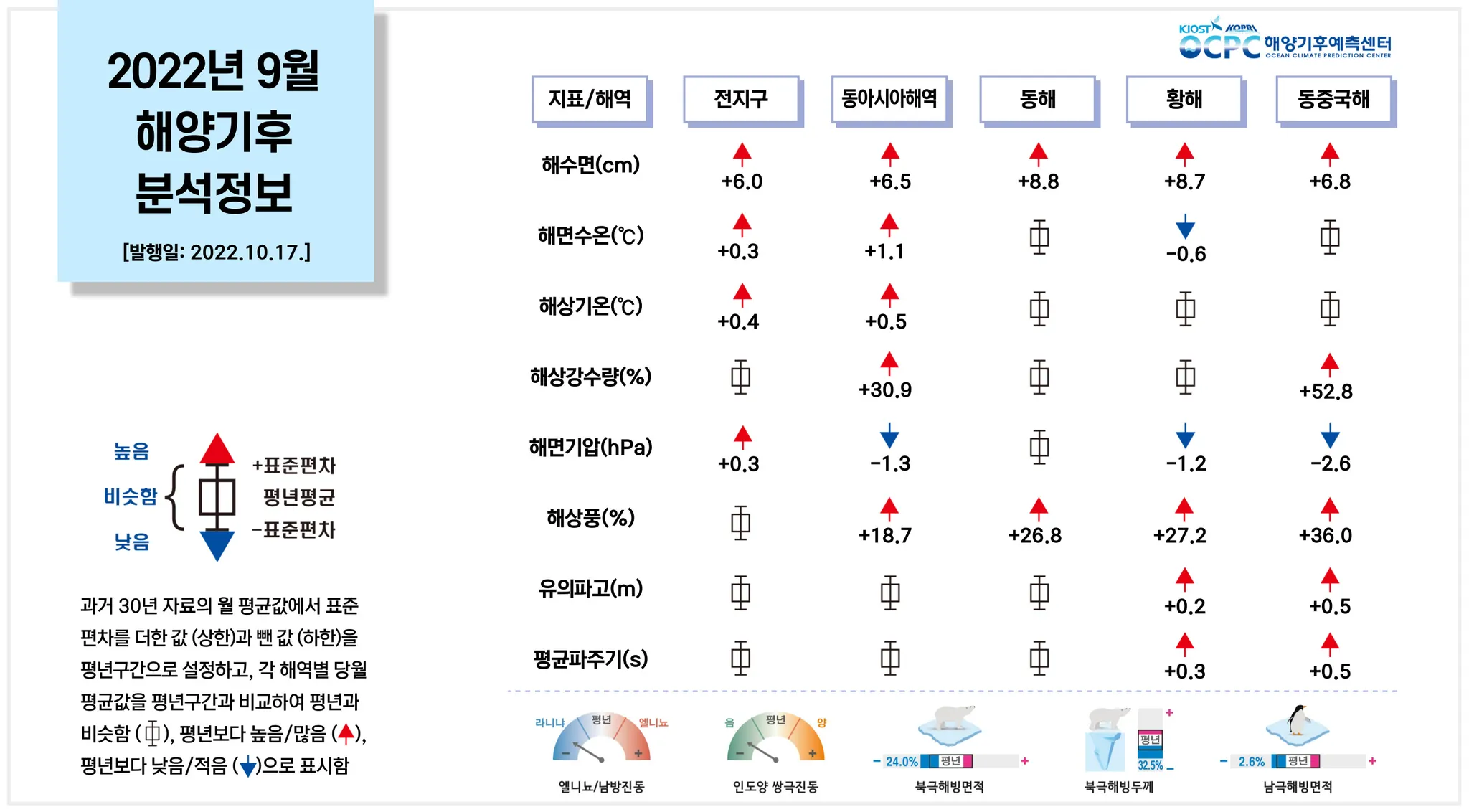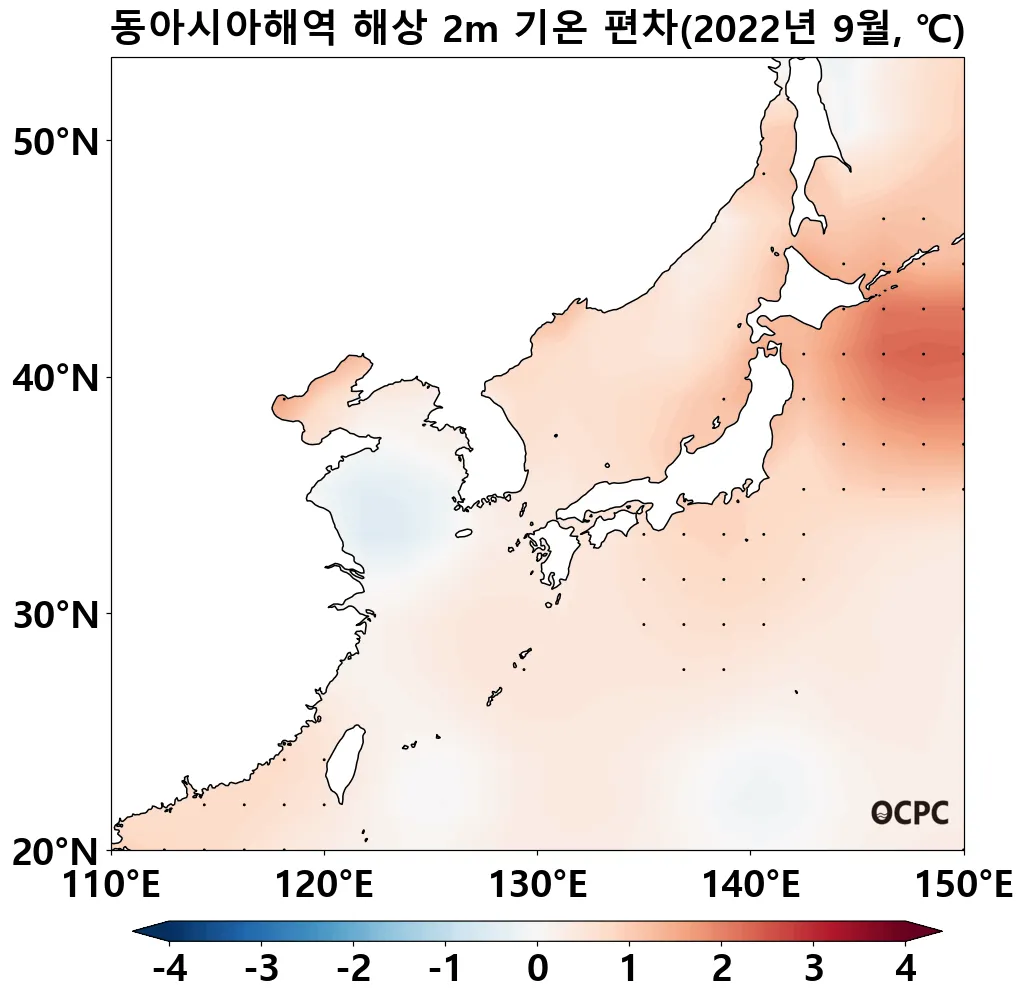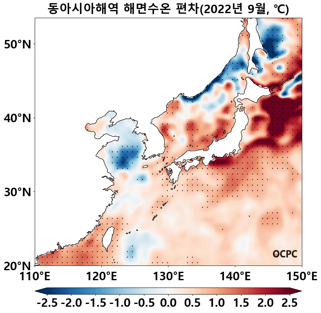 [해면수온] 전지구와 동아시아해역의 해면수온은 평년보다 0.3~1.1°C 높았으며, 황해는 0.6°C 낮았습니다. 특히 동아시아해역은 1982~2022년(9월) 중 가장 높았습니다.