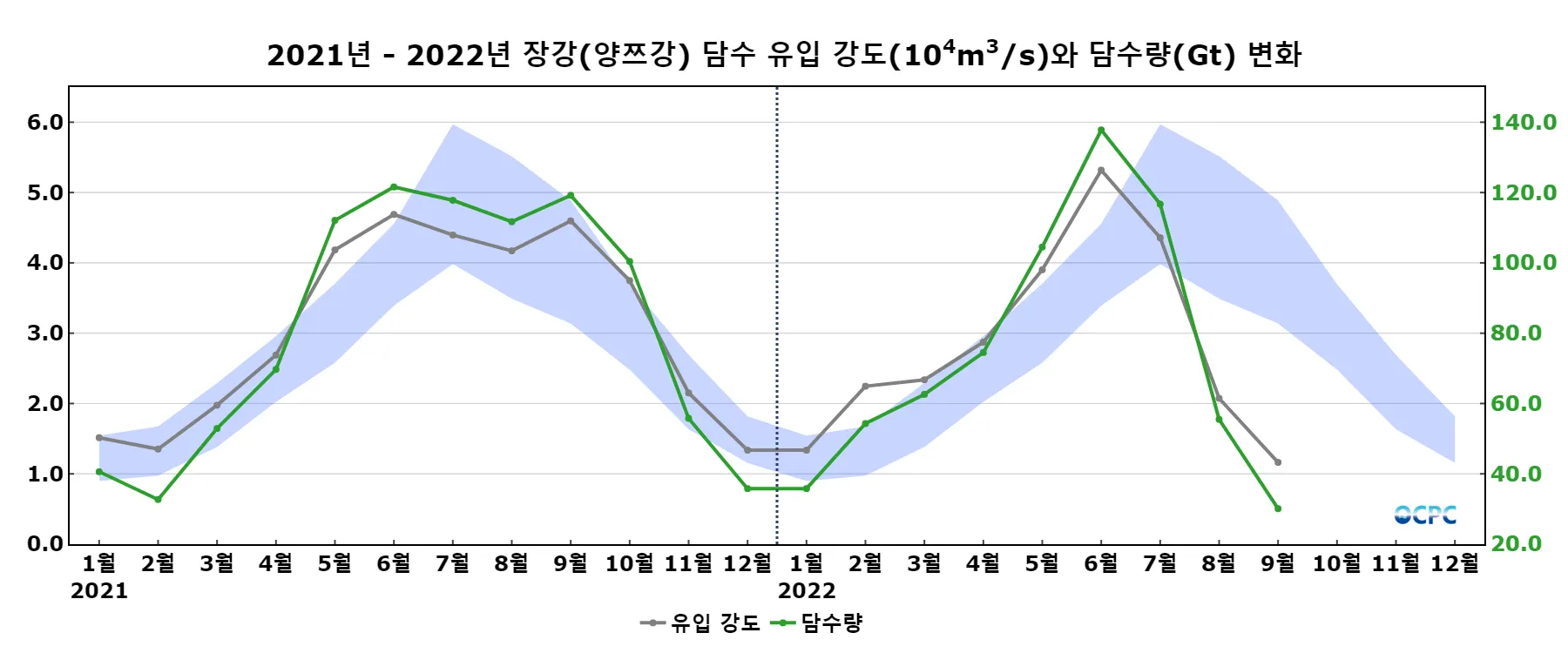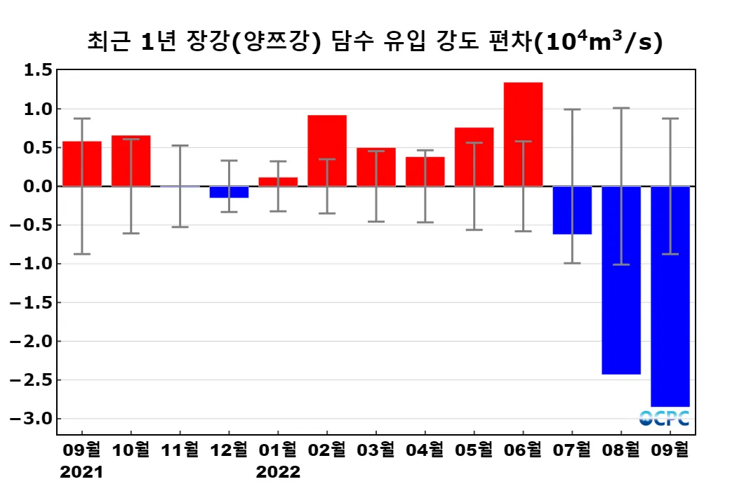 9월 한 달 동안 동중국해로 유입된 담수량으로 환산하면, 30.1기가톤(1Gt=10⁹m³=1km³)으로 평년(104.0기가톤)보다 73.9기가톤 감소했습니다.