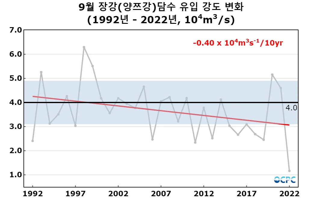 1992~2022년 동안 9월 장강 담수 유입 강도는 10년에 초당 4,000톤(한 달 동안 유입된 담수량으로 환산하면 10년에 10.4기가톤)씩 감소하는 추세입니다.