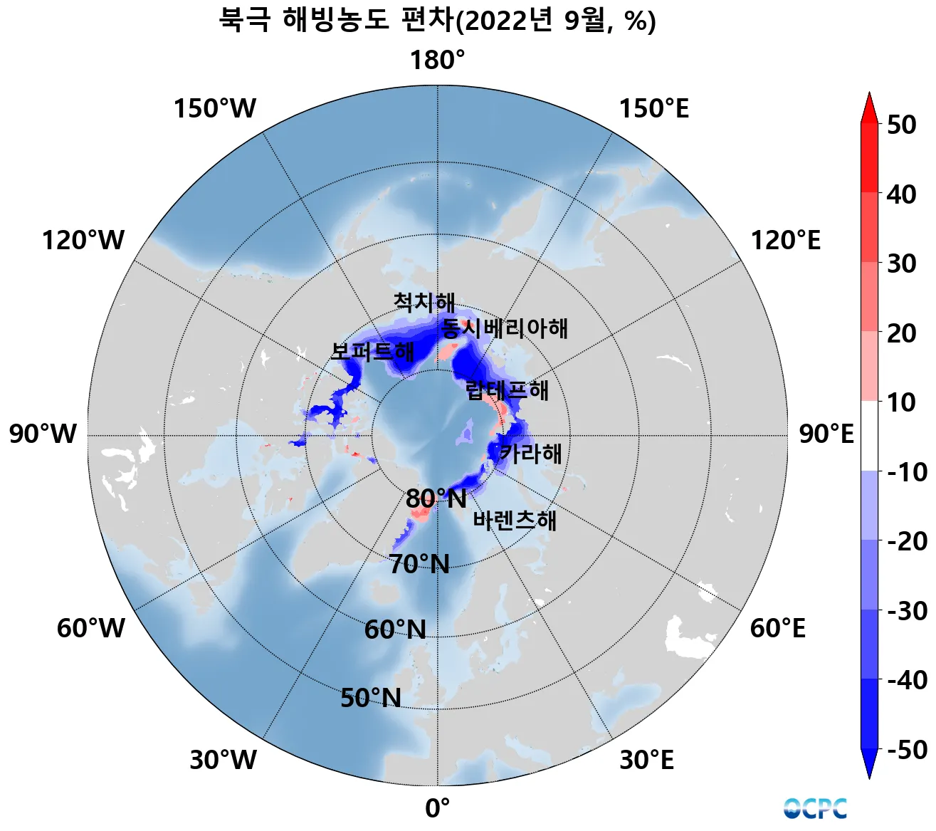동시베리아해, 그린란드해, 랍테프해-카라해 사이 해역을 제외한 대부분의 해역에서 평년보다 해빙면적이 감소했습니다.