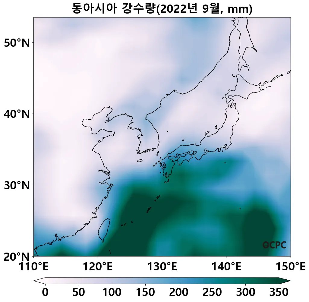 [동아시아 해역] 해면수온은 평년보다 1.1°C 높아 1982년 이래 9월 해면수온 중 역대 최고를 기록하였습니다. 평년보다 많이 발생한 대부분의 태풍이 동아시아 해역에 영향을 끼치고 해면기압은 낮아지고, 해상강수량은 증가했습니다.