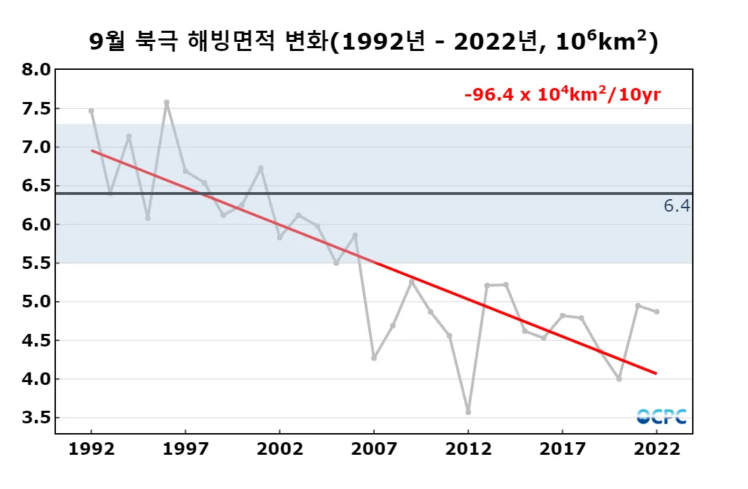 1992~2022년 동안 9월 북극 해빙면적의 경향은 10년에 96.4만km²씩 감소하는 추세에 있습니다.