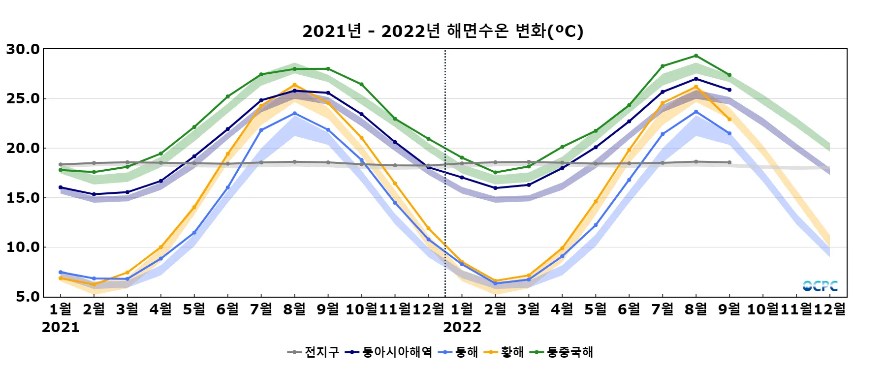 동해, 황해, 동중국해의 해상기온은 평년(19.2°C, 22.2°C, 25.7°C)과 비슷했습니다.