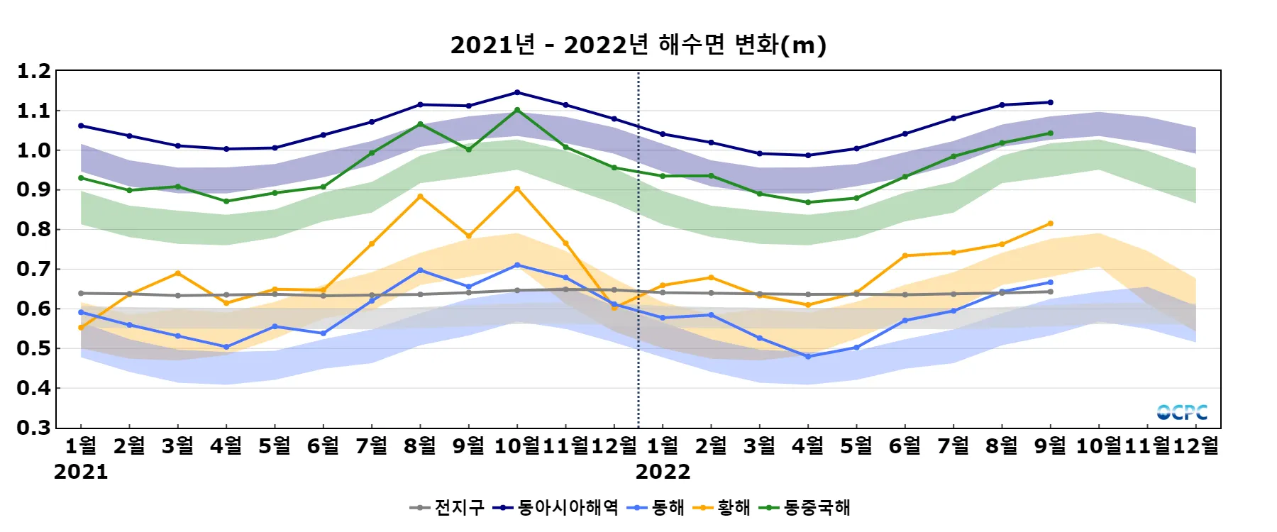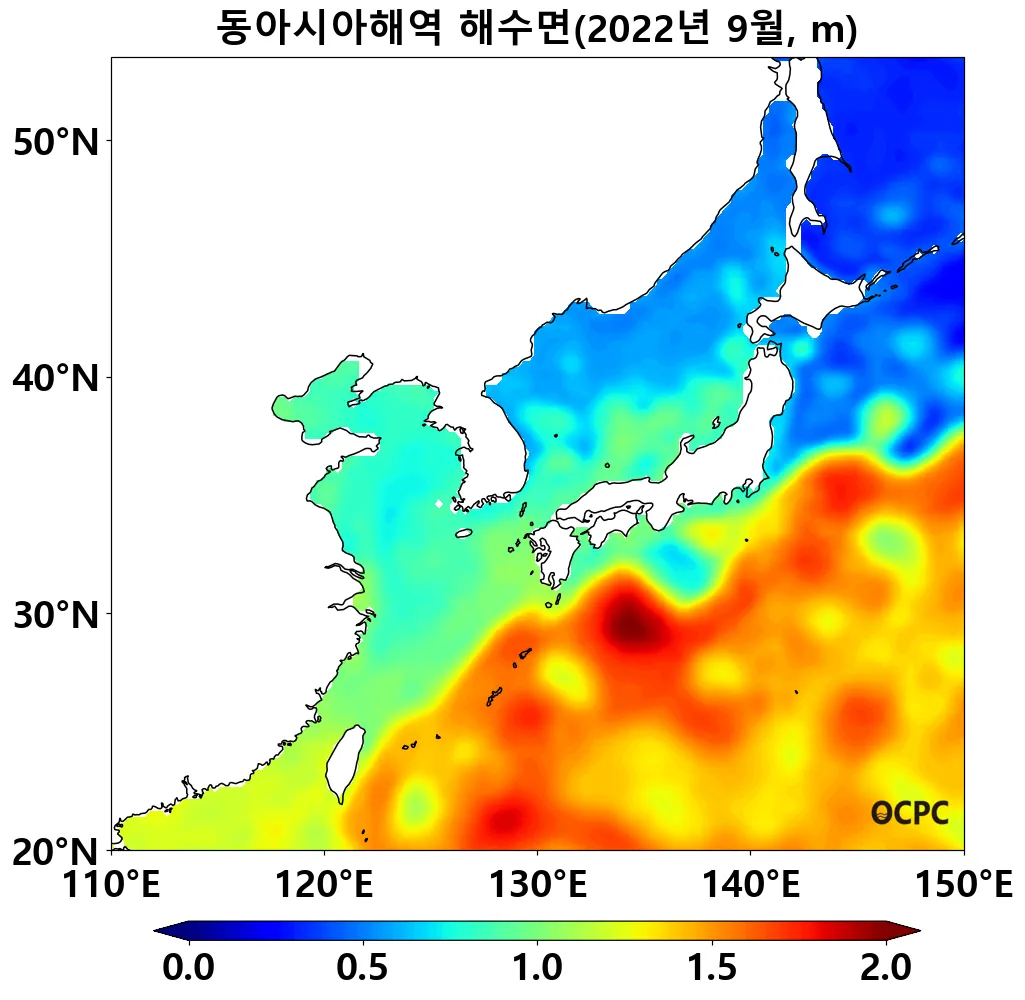 동해와 황해의 해수면은 평년보다 각각 8.8cm, 8.7cm 높았으며, 동중국해는 평년보다 6.8cm 높았고 모두 1993~2022년(9월) 중 가장 높았습니다.