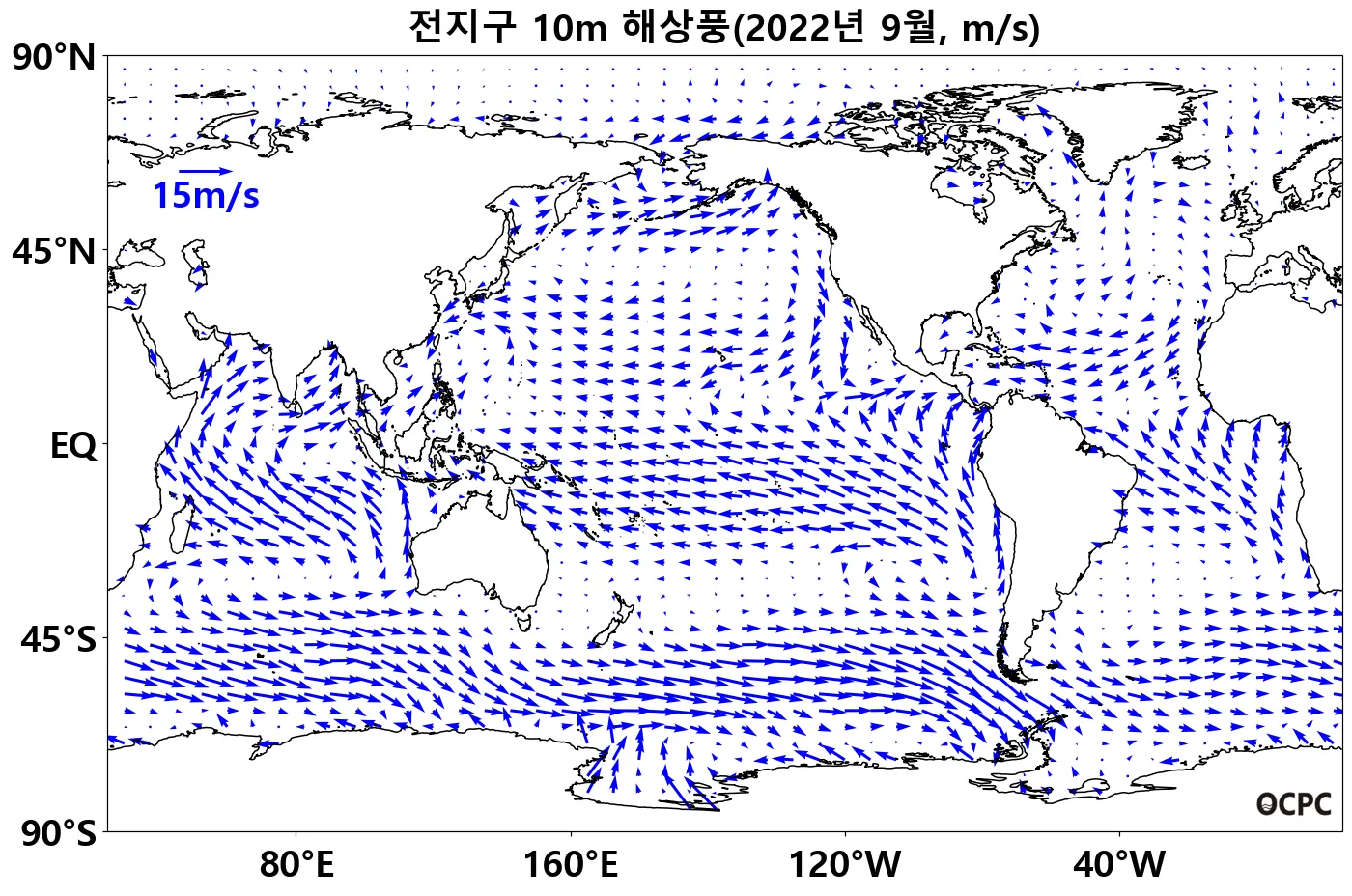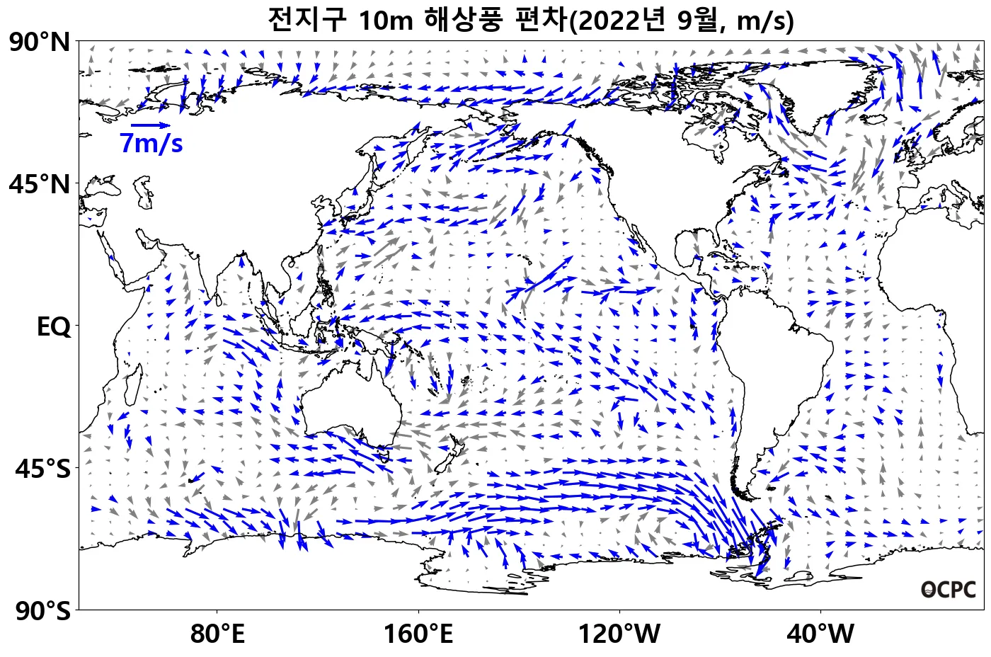 열대 태평양(130°E~130°W, 10°S~0°)의 무역풍(동풍)은 평년보다 강했으며, 남태평양 중위도(170°E~60°W, 75°S~45°S) 해역에서 저기압과 관련된 시계방향 해상풍이 나타났습니다.