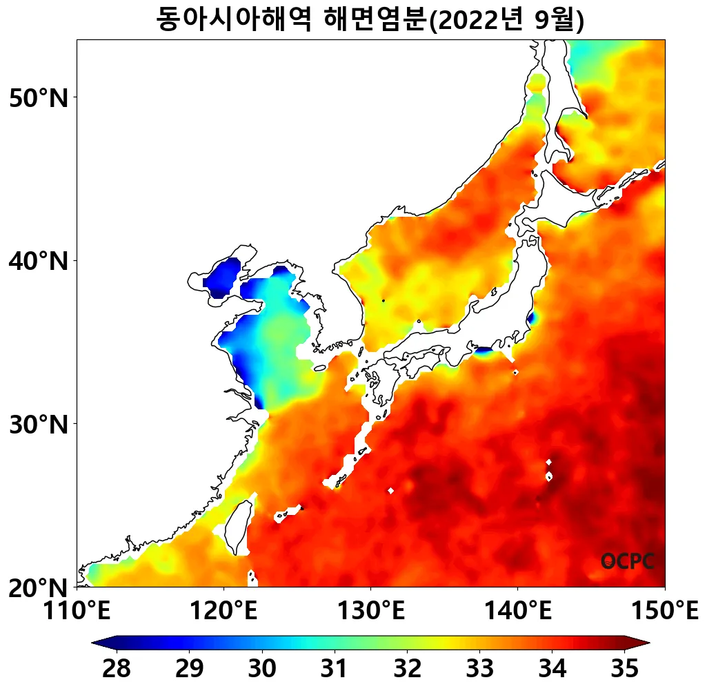 인공위성 추정 해면염분 분석 결과 동중국해와 제주도 주변 해역의 해면염분이 예년에 비해 높아졌으며, 이는 장강 담수유입 감소와 태풍의 영향으로 판단됩니다.