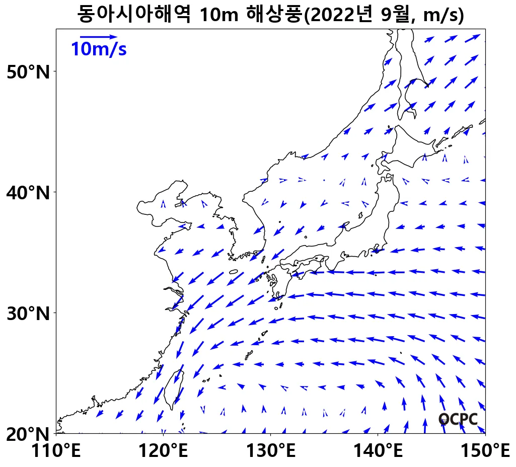 1992~2022년 동안 전지구 및 동아시아해역 9월 해상풍속은 10년에 0.1m/s씩 증가하는 추세이나, 동중국해는 10년에 0.1m/s씩 감소하는 추세입니다.