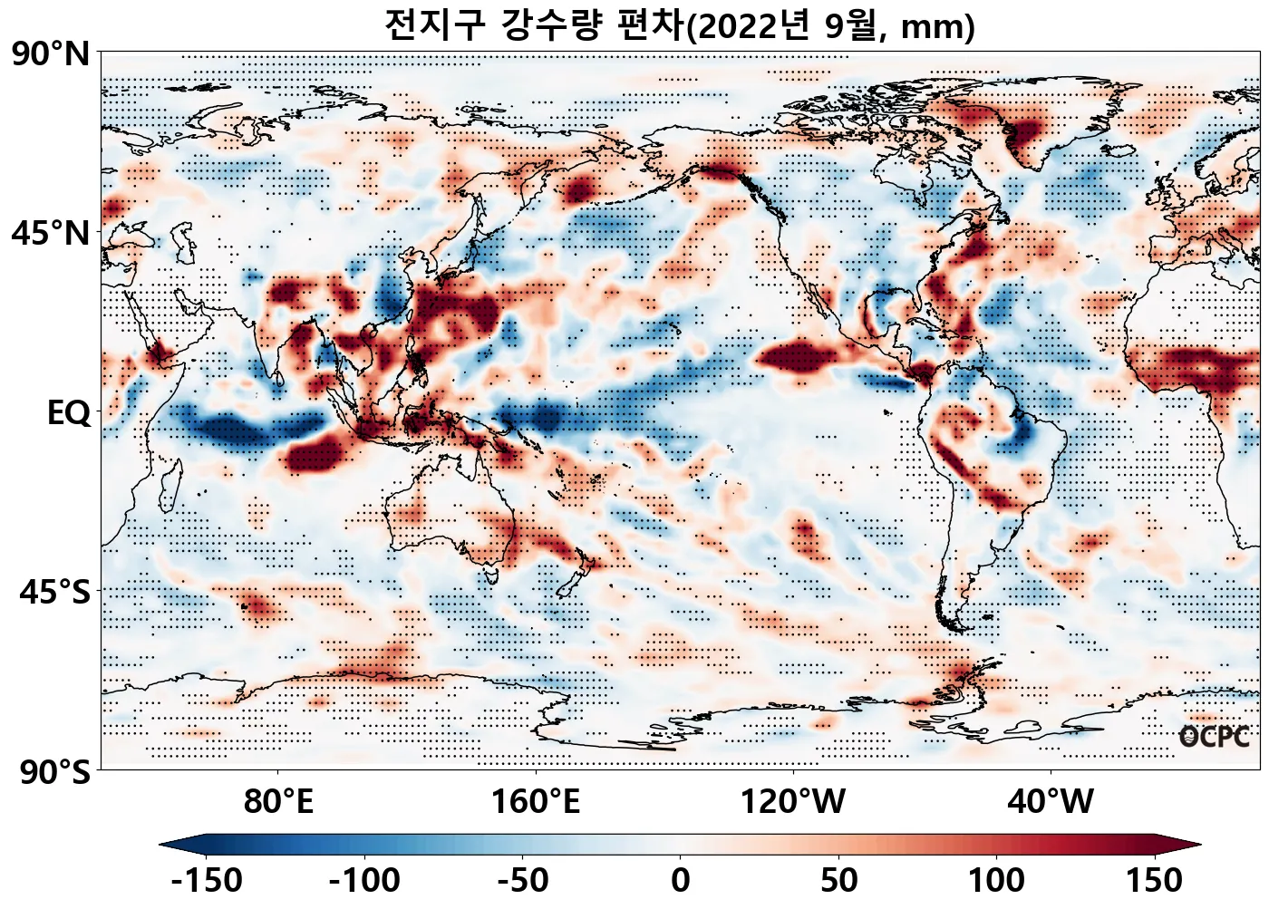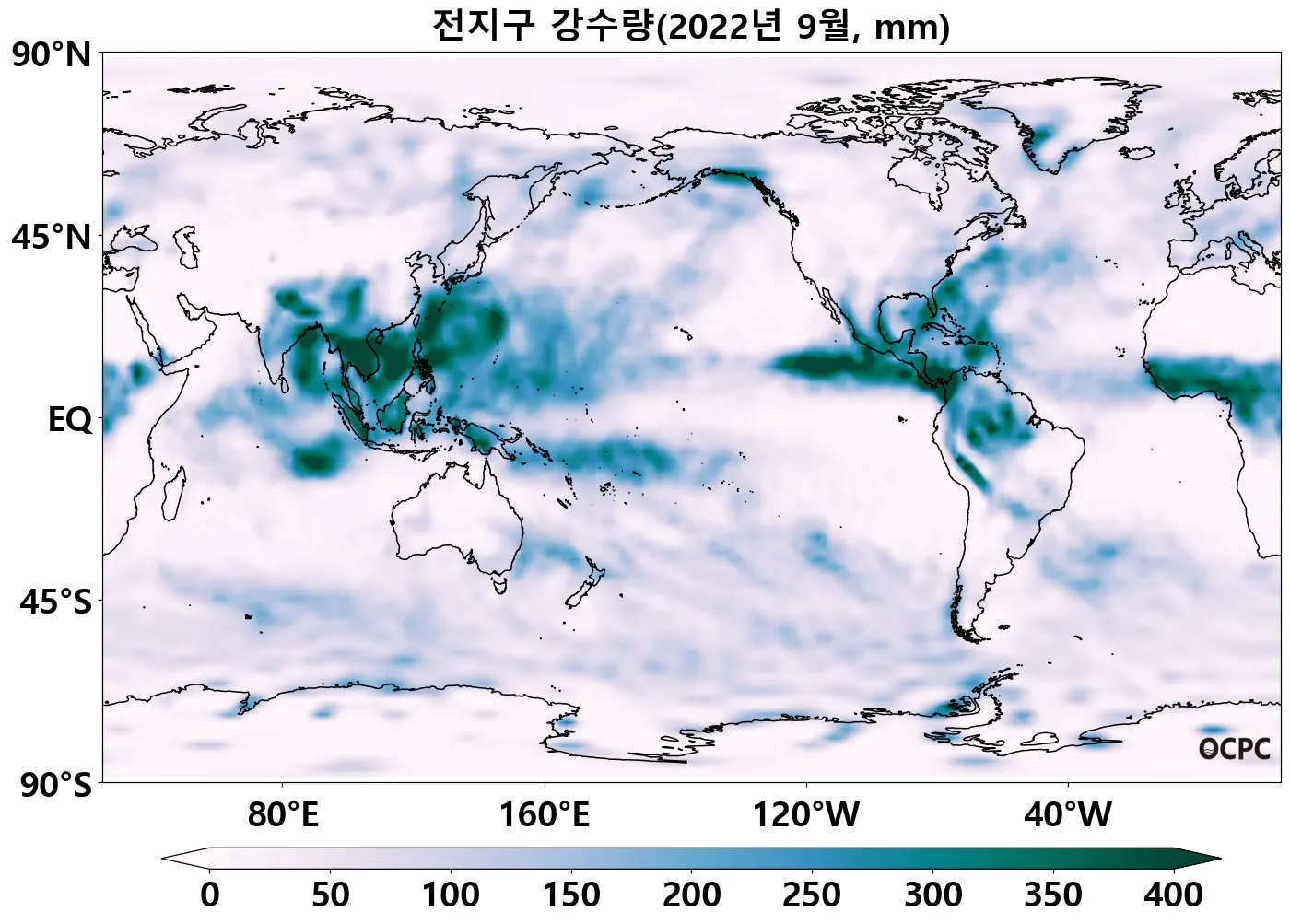 전지구 평균 해상강수량은 평년(86.9mm)과 비슷했으며, 열대 서태평양(150°E~170°E, 5°S~0°), 열대 인도양(50°E~95°E, 10°S~0°)은 평년보다 적었습니다.