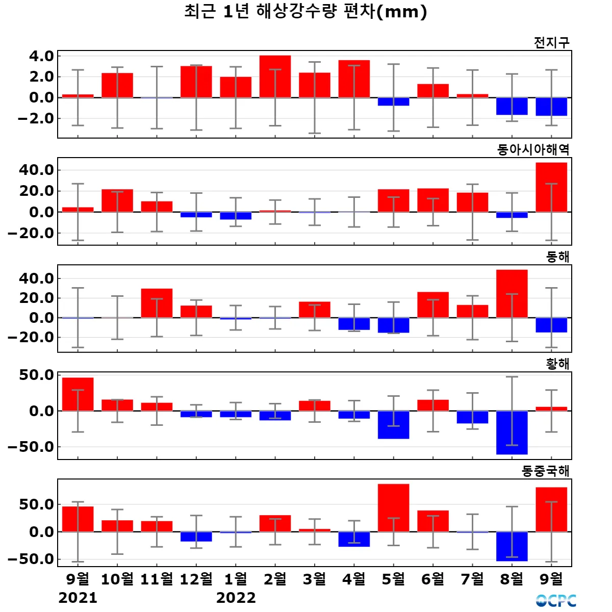 1992~2022년 동안 전지구 평균 해상강수량은 10년에 0.6mm씩 감소하는 추세이며, 동아시아 해역은 5.6mm씩 증가하는 추세입니다.