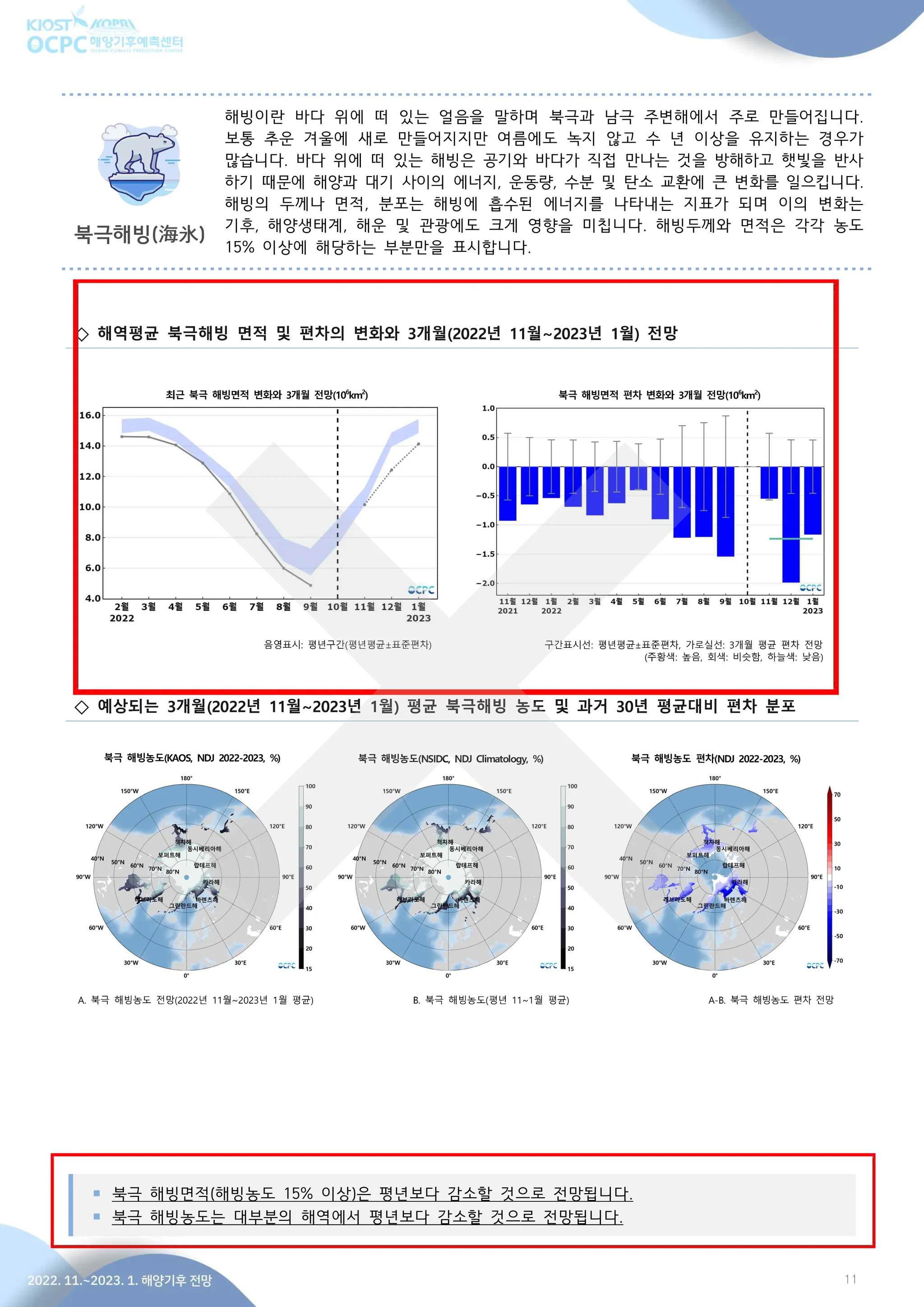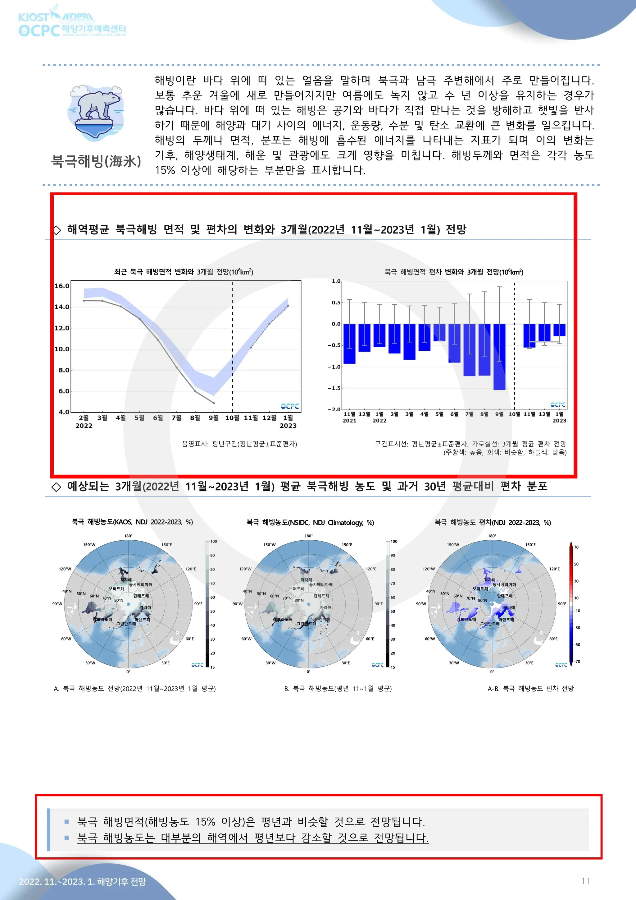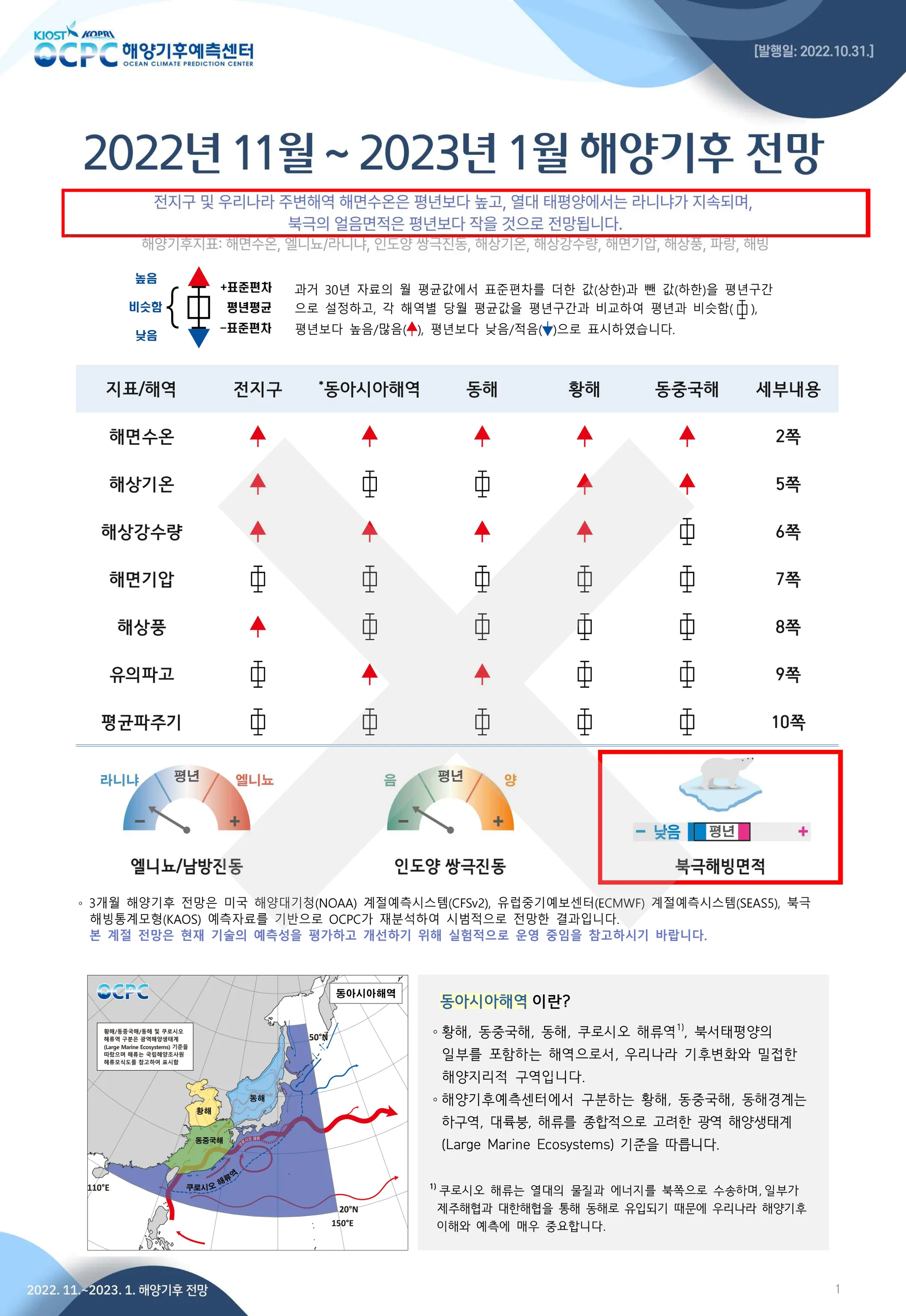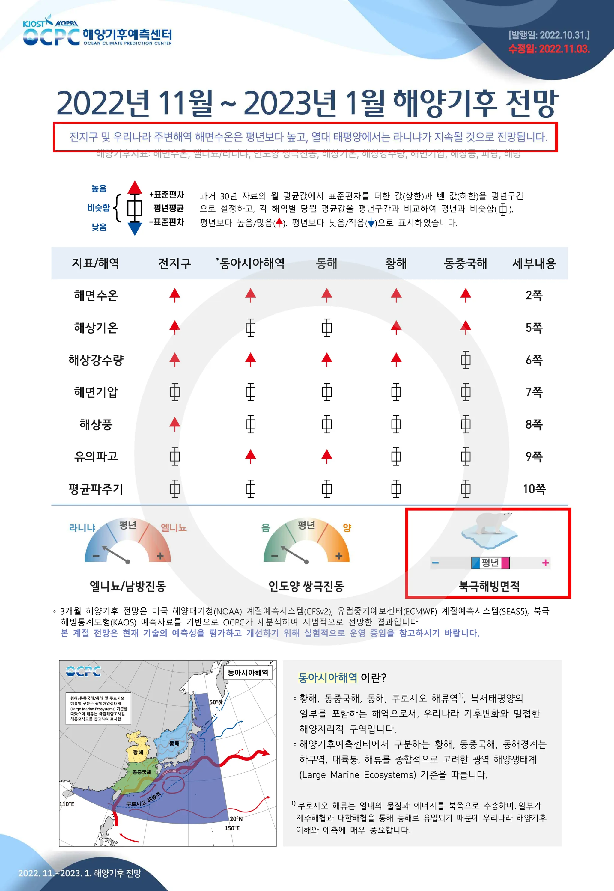 2022년 10월 31일 발간된 2022년 11월~2023년 1월 해양기후 시범 전망 내용에 오류(북극해빙면적)가 발견되어 다음과 같이 사후 수정하였음을 알려드리오니 양해 부탁드립니다.