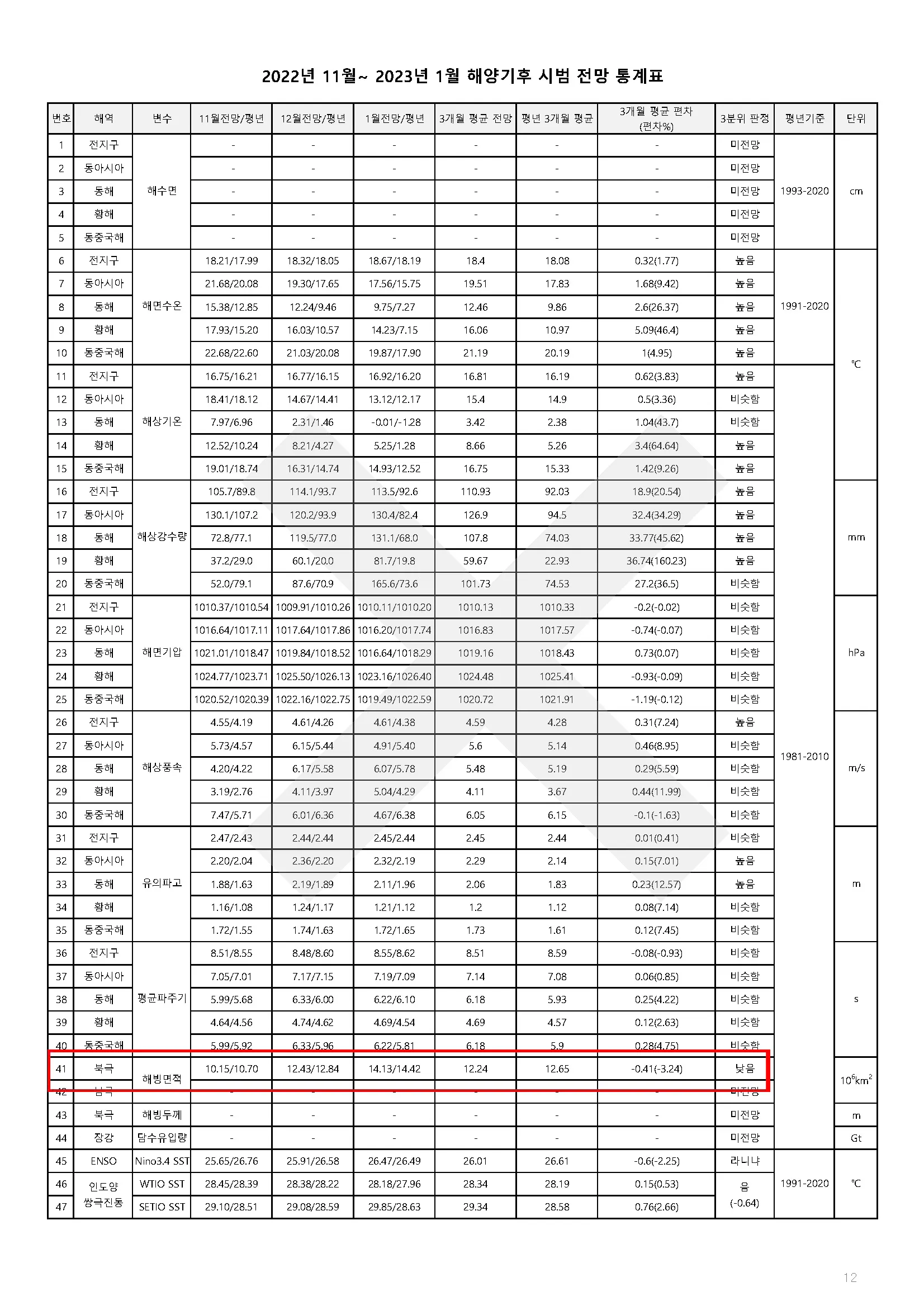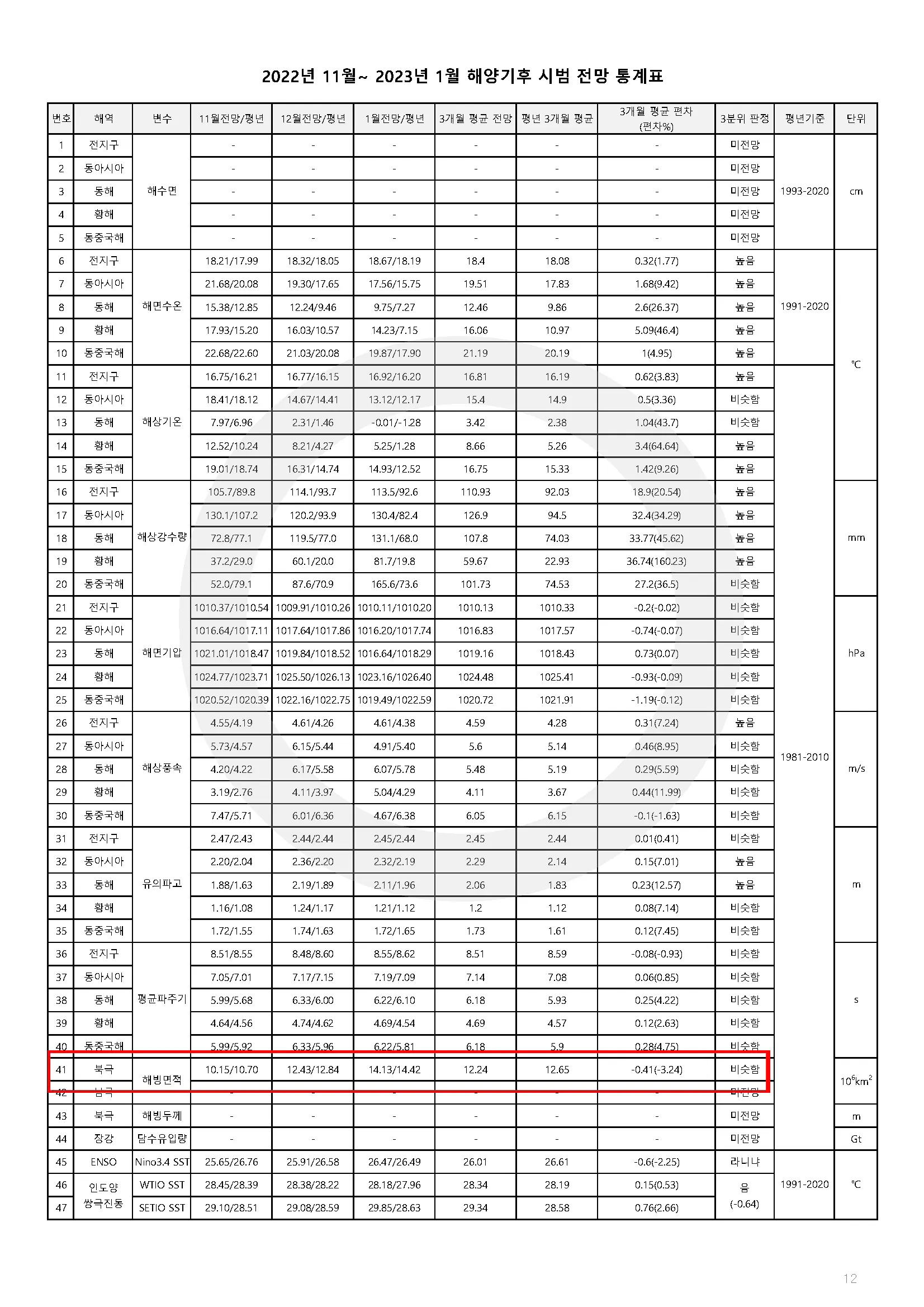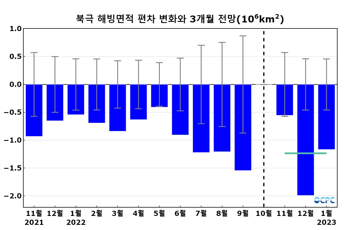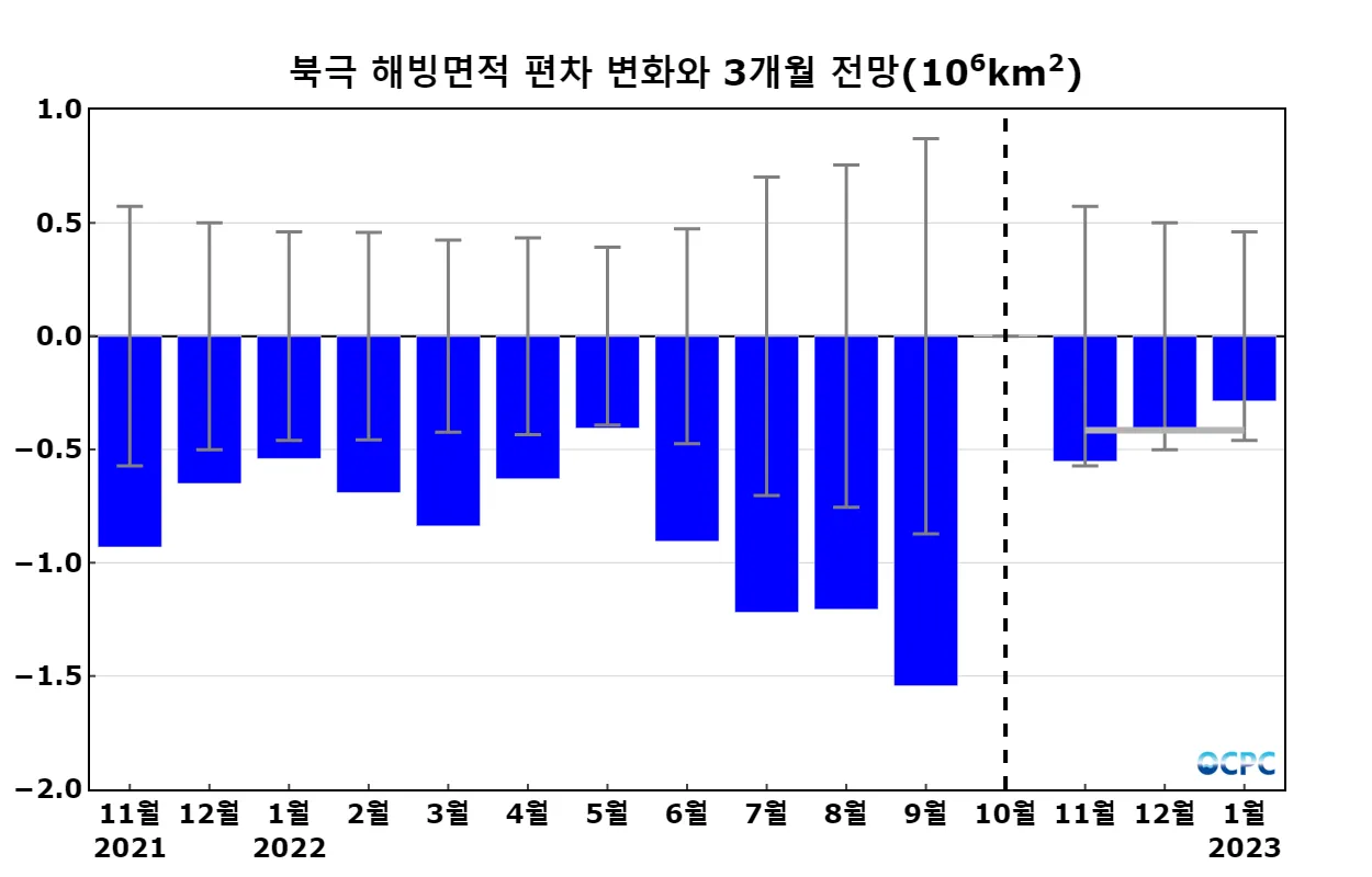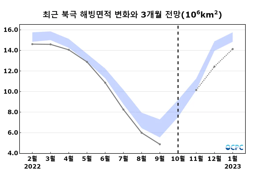 2022년 10월 31일 발간된 2022년 11월~2023년 1월 해양기후 시범 전망 내용에 오류(북극해빙면적)가 발견되어 다음과 같이 사후 수정하였음을 알려드리오니 양해 부탁드립니다.