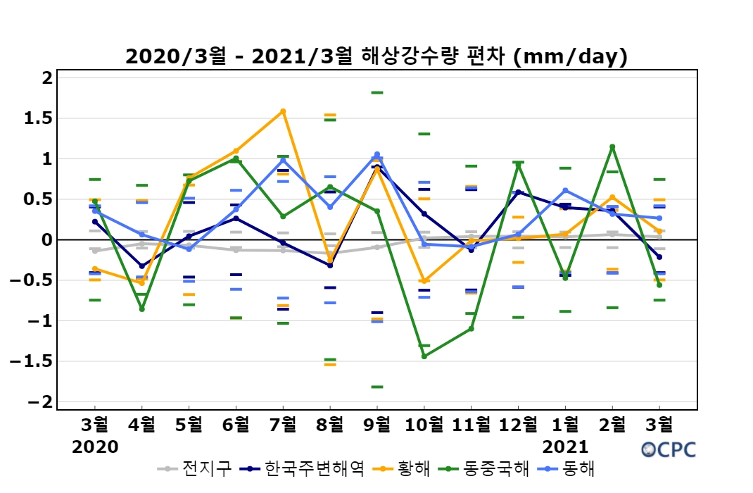 2021년 3월 한국주변해역 해상강수량 평년대비 표준편차 초과 해역