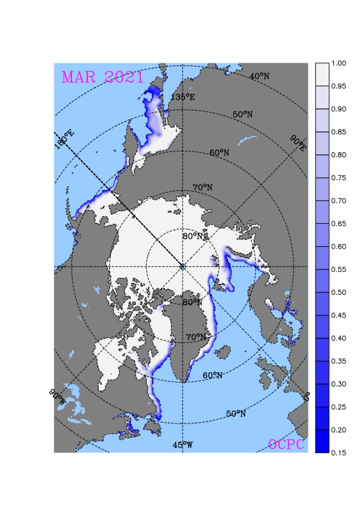 2021년 3월 북극 해빙면적 (해빙 농도 15% 이상 해역) 분포