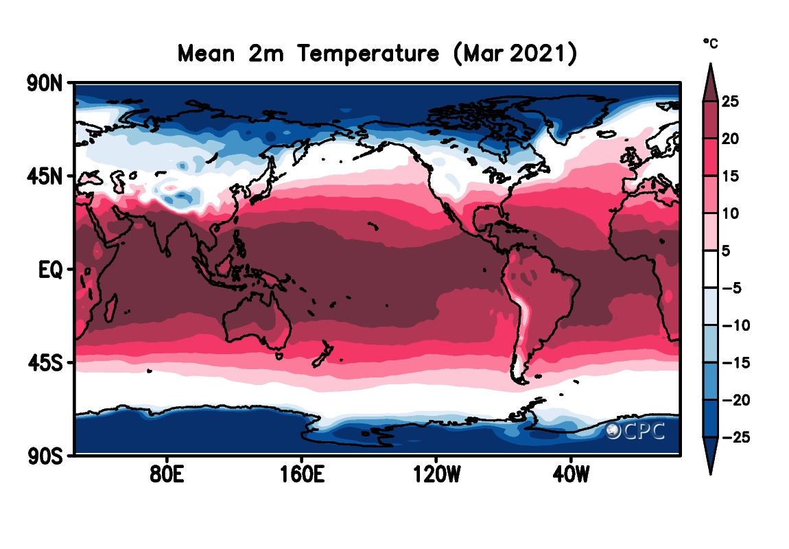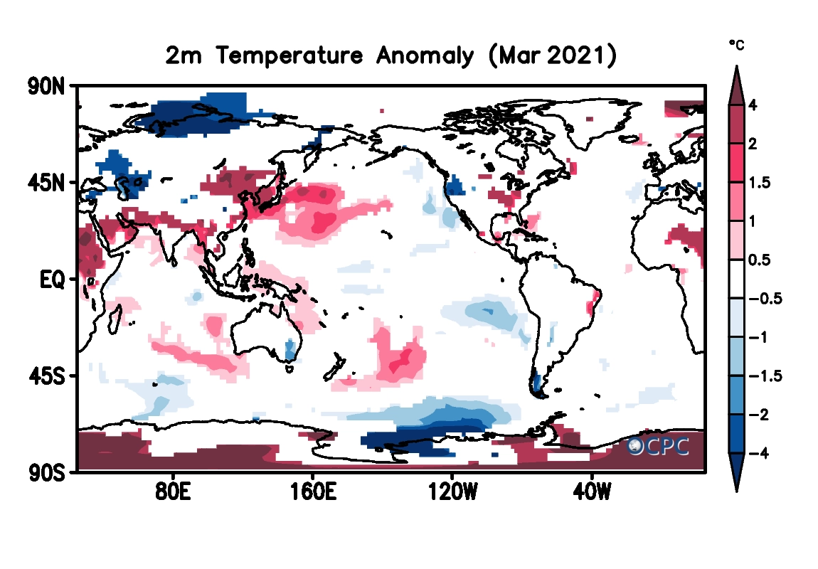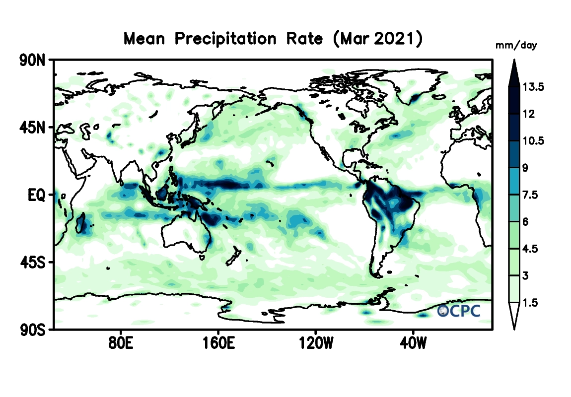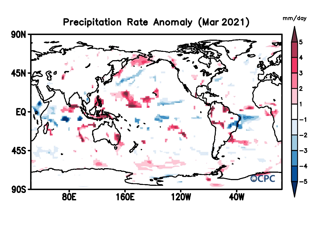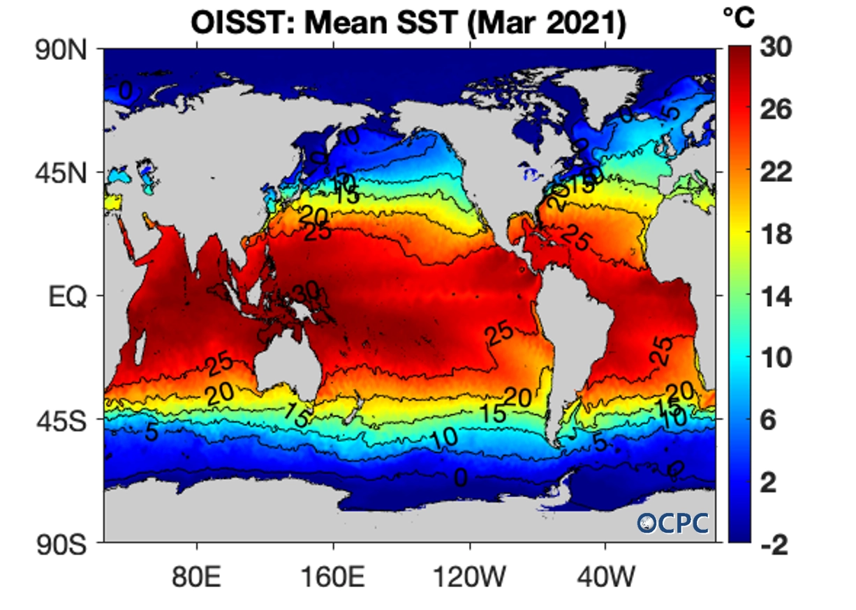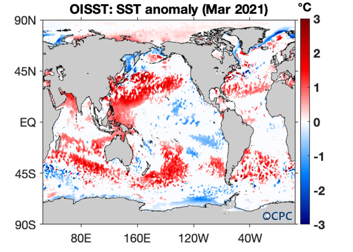 전지구 평균 해면수온은 18.6 °C로 평년(18.4 °C)보다 0.2 °C 높았으며, 라니냐 현상의 약화에 따라 동태평양은 평년과 거의 비슷해졌으나, 북서태평양은 여전히 높았습니다.