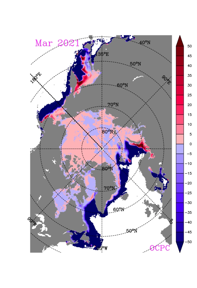 2021년 3월 북극 해빙농도 평년 평균 대비 편차 (%)