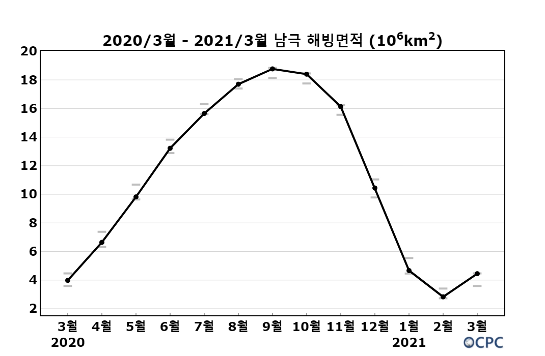 이는 3월 최소 면적(270만 km²)을 기록한 2017년 보다는 175만 km² 크고 3월 최대 면적(528만 km²)을 기록한 2008년 보다는 83만 km² 작은 값입니다.