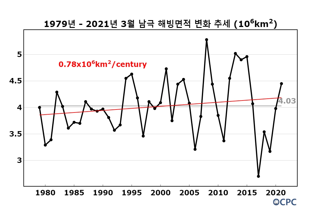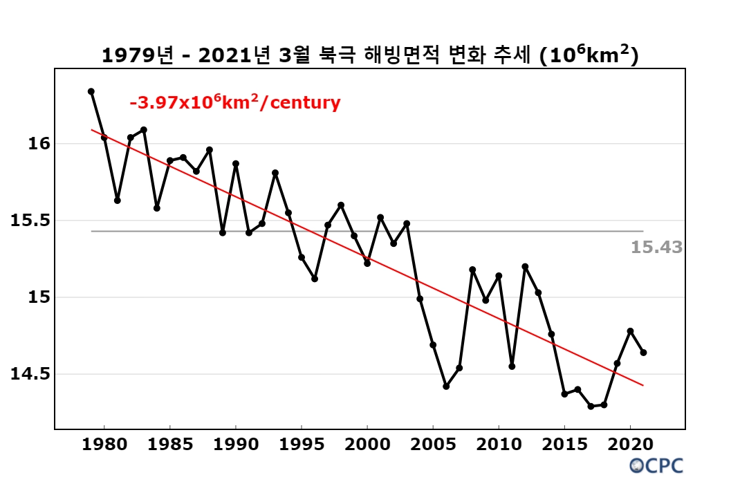 2021년을 포함한 3월 해빙면적은 100년 당 397만 km² 줄어드는 추세입니다.