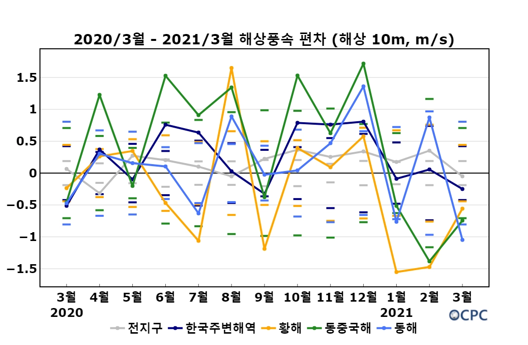 월평균 해상풍속 편차(월별 수평선: 평년 표준편차 구간)