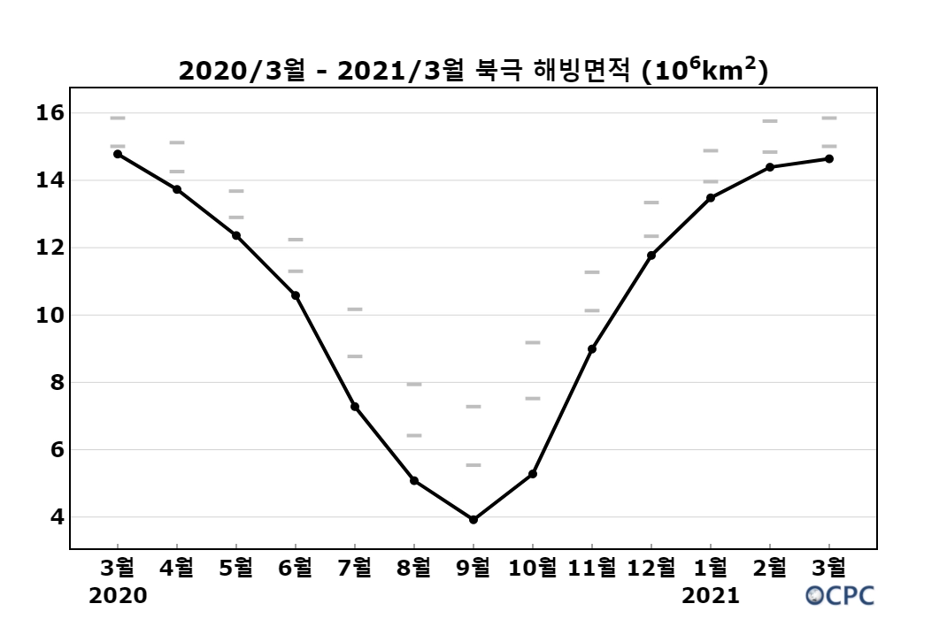 북극 해빙면적은 1,464만 km²로 평년 면적(1,543만 km²) 보다 79만 km²(5.1 %) 작았습니다. 이는 최소 면적을 기록한 2017년 3월 보다는 35만 km² 늘어난 값입니다.