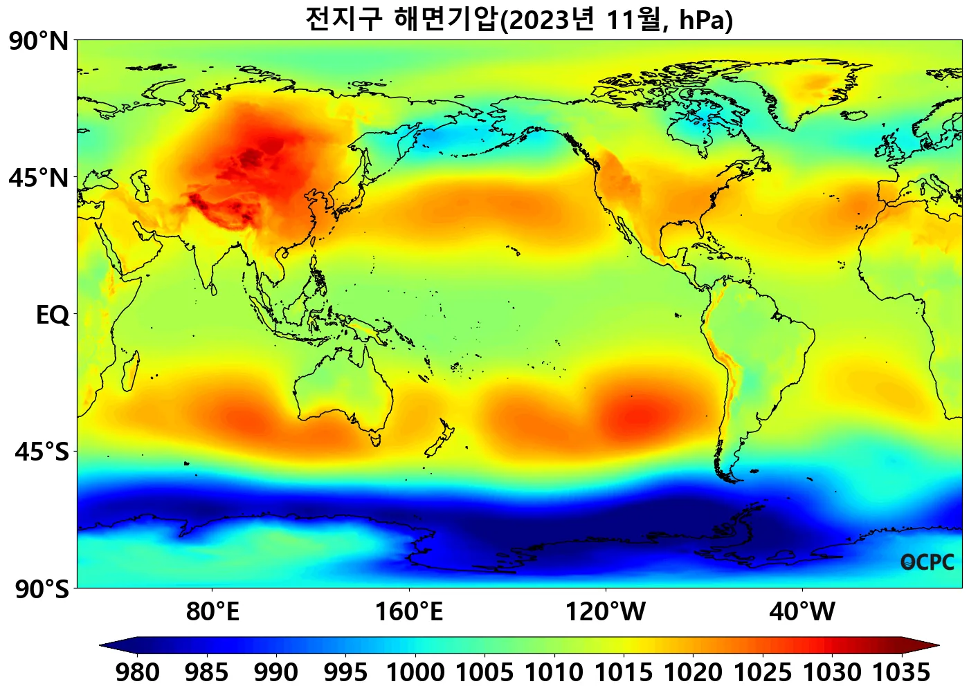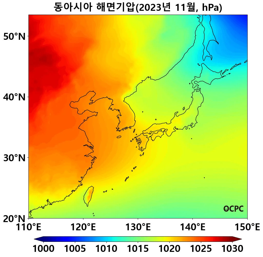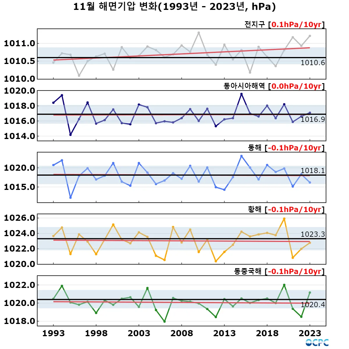 1993~2023년 동안 전지구의 11월 해면기압은 10년에 0.1hPa씩 증가하는 추세이며, 동해, 황해, 동중국해의 11월 해면기압은 10년에 0.1hPa씩 감소하는 추세입니다.