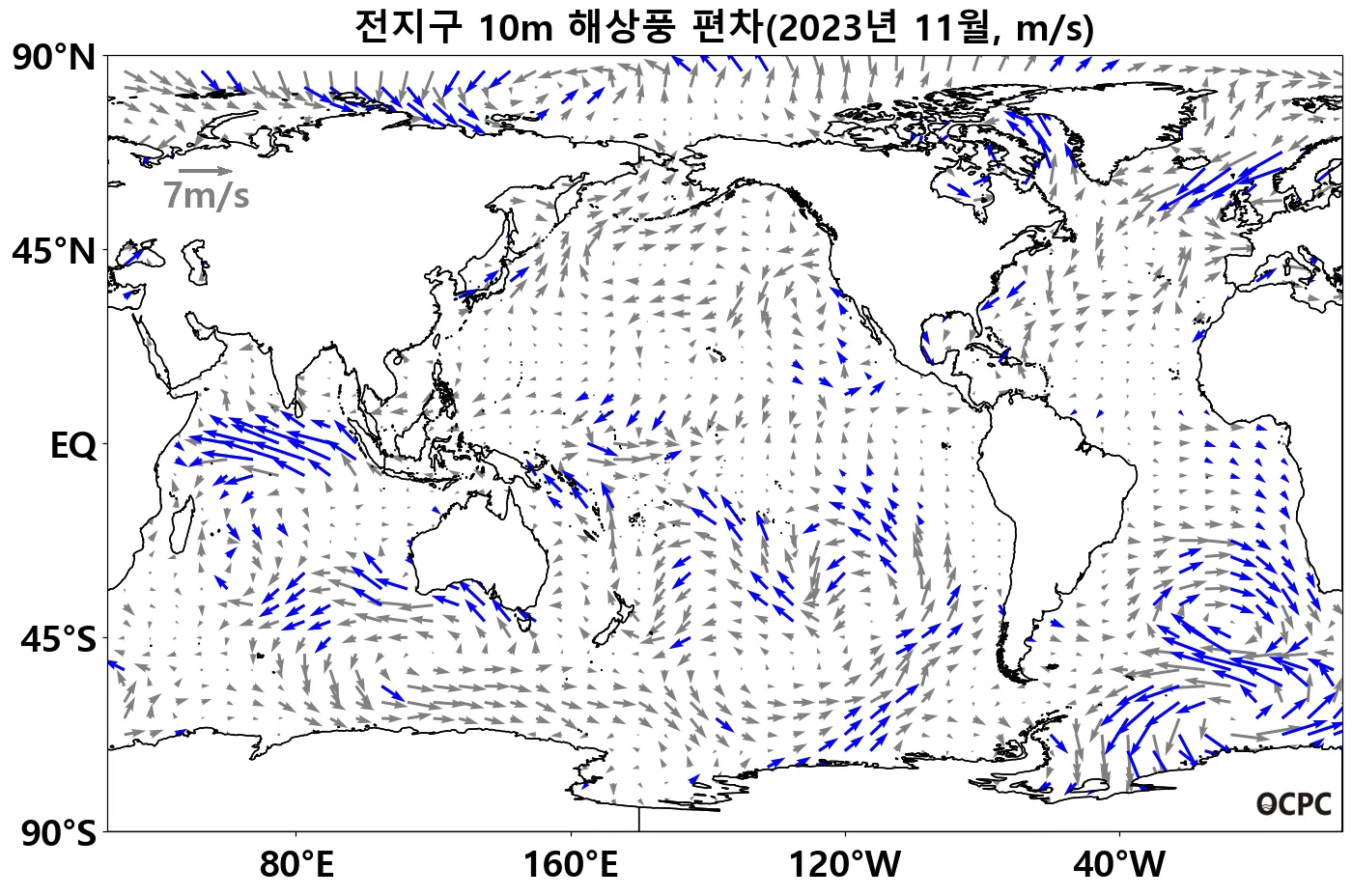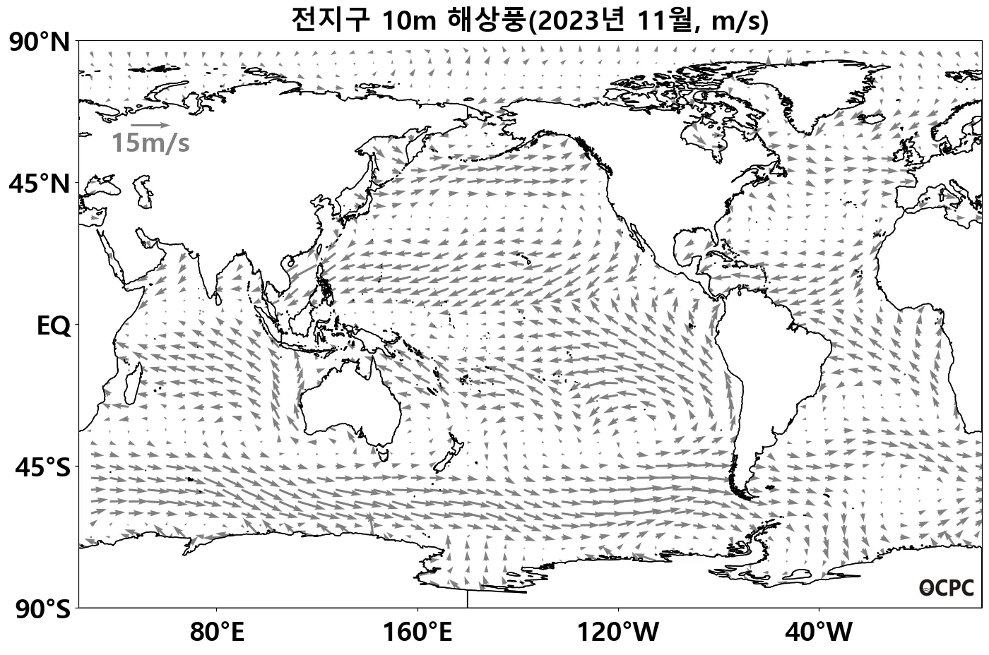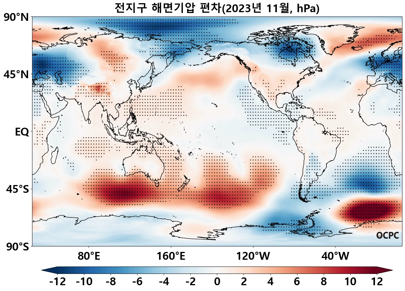 1993~2023년 동안 전지구의 11월 해면기압은 10년에 0.1hPa씩 증가하는 추세이며, 동해, 황해, 동중국해의 11월 해면기압은 10년에 0.1hPa씩 감소하는 추세입니다.