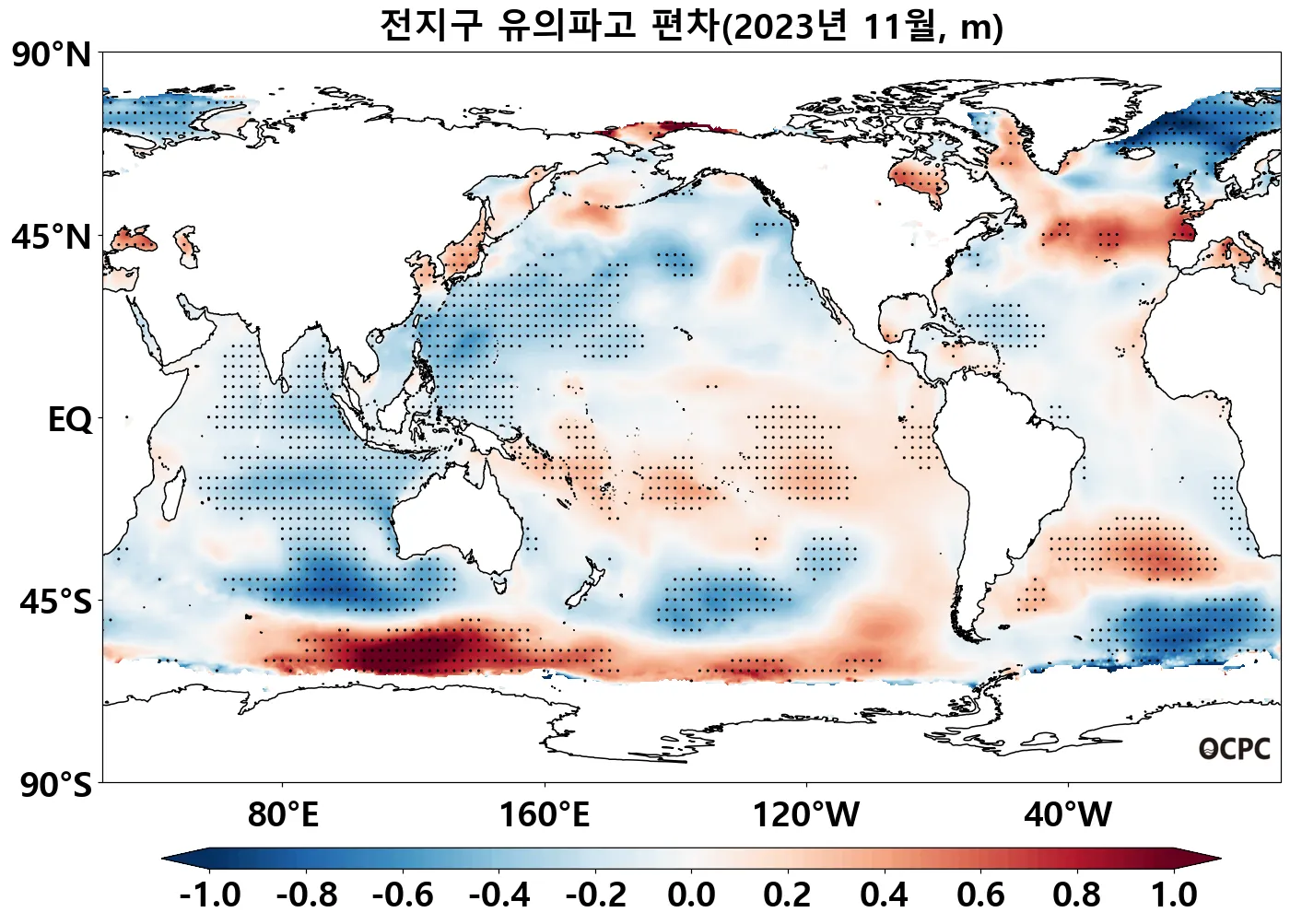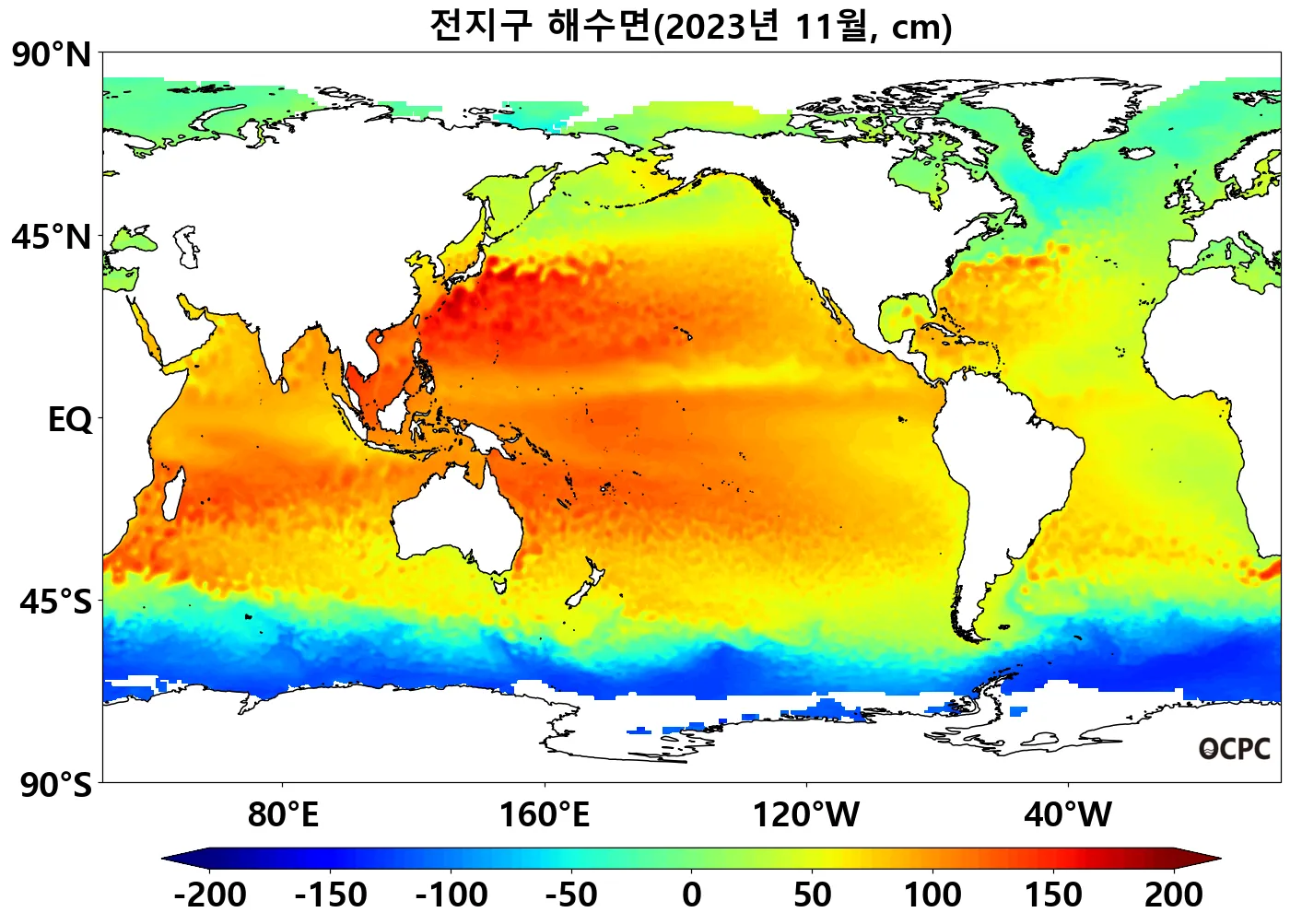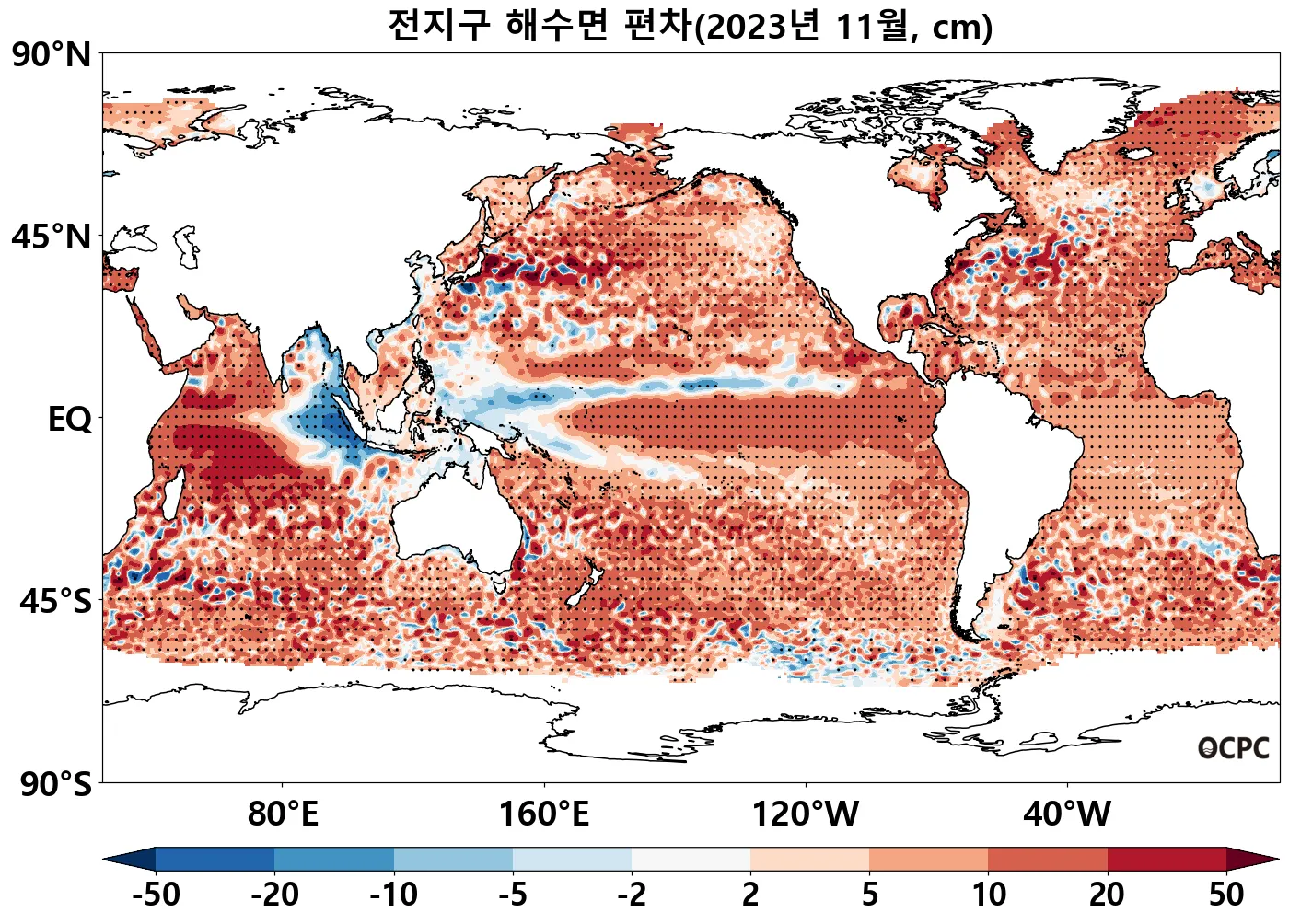 엘니뇨 발달이 지속됨에 따라 동태평양의 해수면이 평년보다 두드러지게 높았으며, 그 주변 해역에서 평년보다 낮은 해수면 편차가 나타났습니다. 또한, 양의 인도양 쌍극진동 영향으로 열대 서인도양의 해수면은 높게, 열대 동인도양의 해수면은 낮게 나타났습니다.