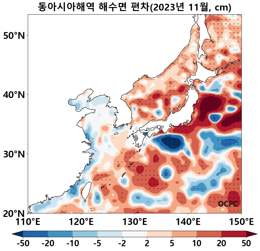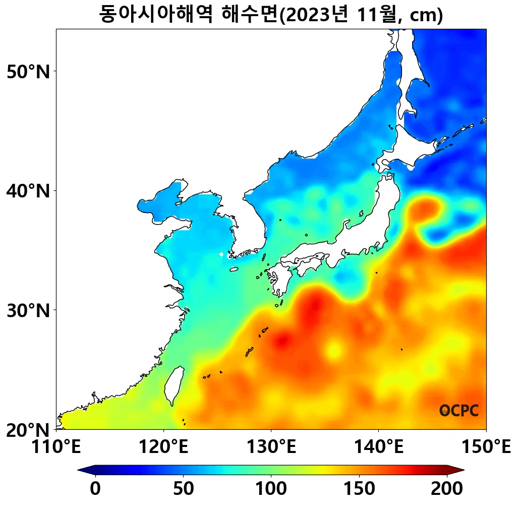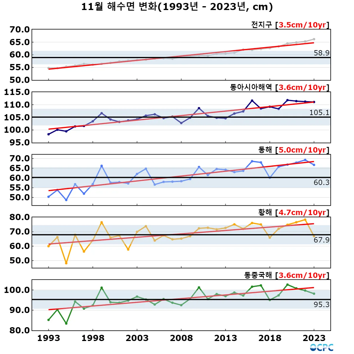 1993~2023년 동안 전지구 평균 11월 해수면은 10년에 3.5cm씩 상승하는 추세입니다. 동아시아해역은 10년에 3.6~5.0cm씩 상승하는 추세로, 그 중 동해의 상승률이 가장 높았습니다.