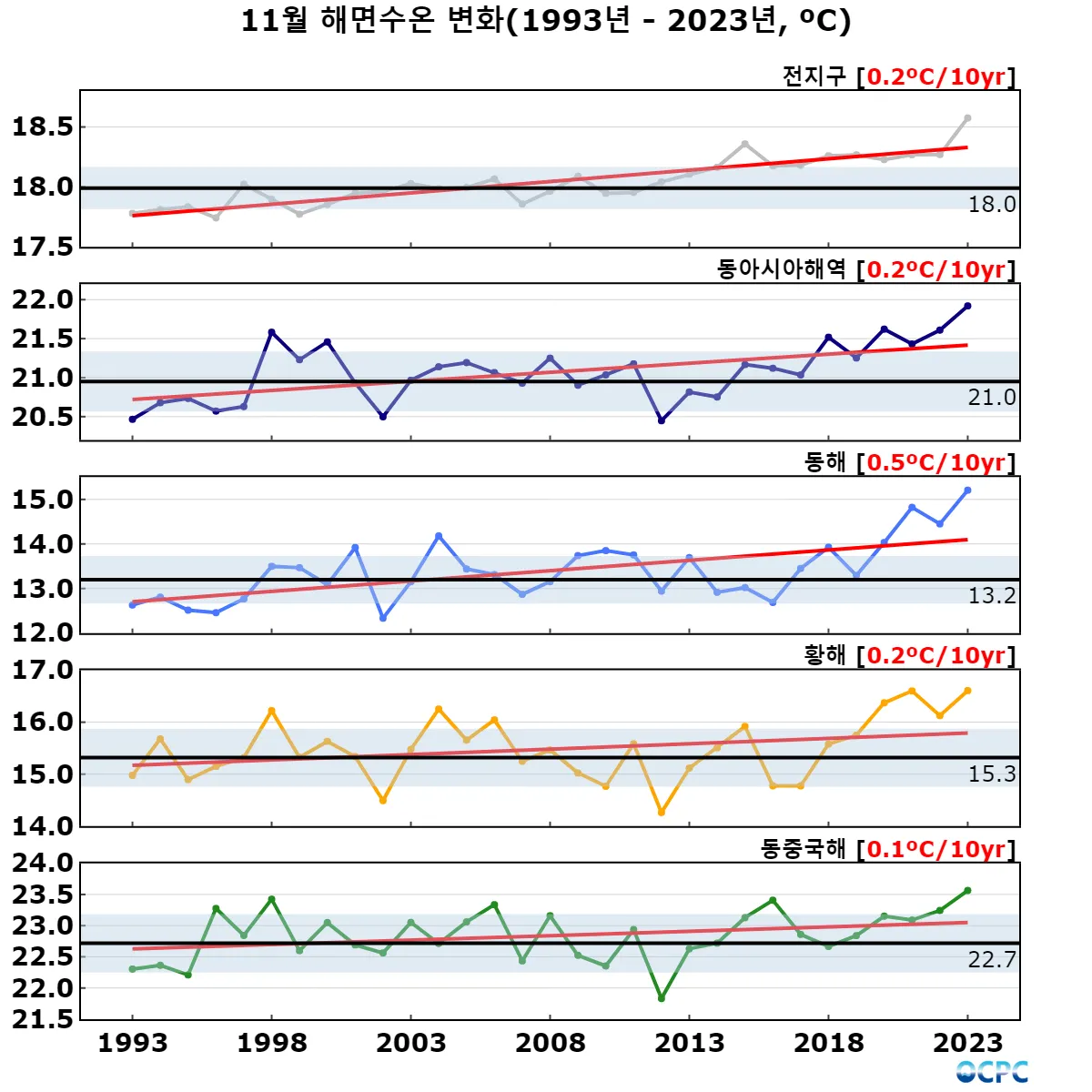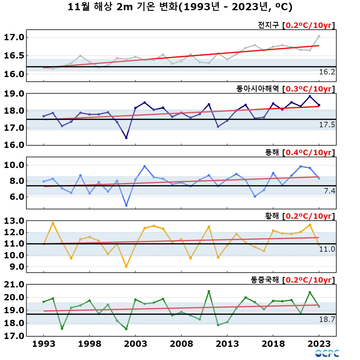 1993~2023년 동안 전지구 11월 해상기온은 10년에 0.2°C씩 증가하는 추세이며, 동아시아해역의 추세는 10년에 0.2~0.4℃로 그 중 동해의 상승률이 가장 큽니다.