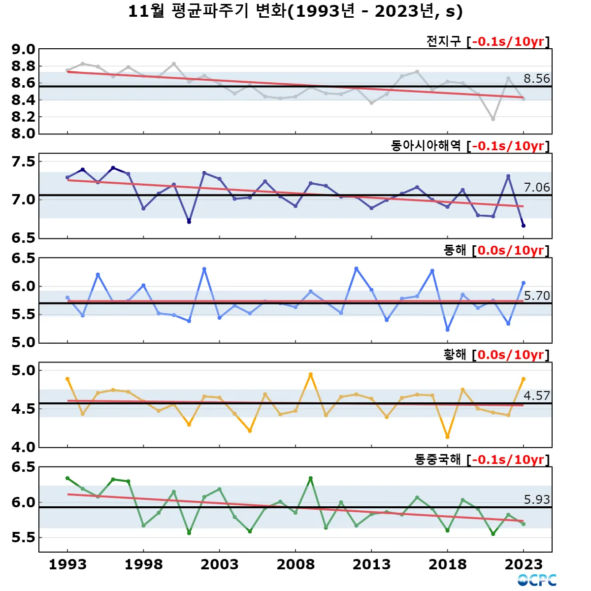 1993~2023년 동안 전지구, 동아시아해역의 11월 평균파주기는 10년에 0.1초씩 감소하는 추세입니다.