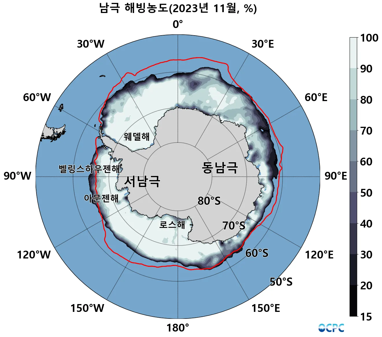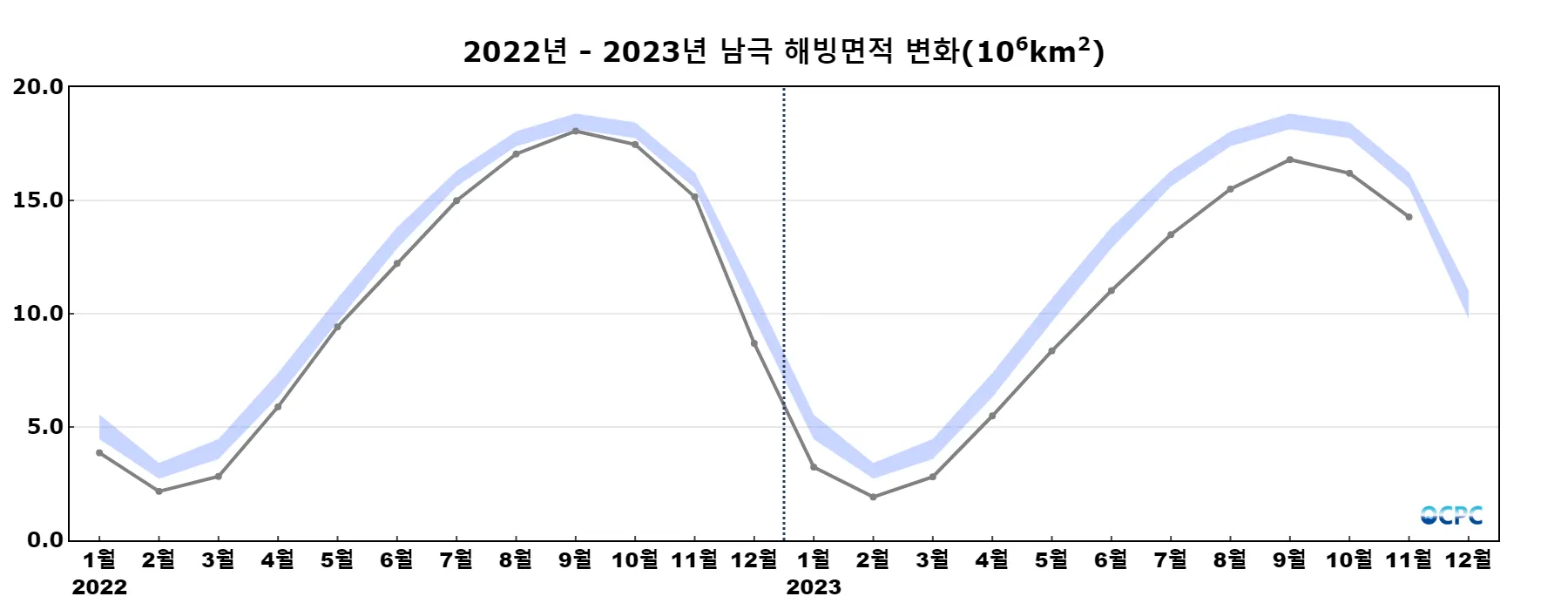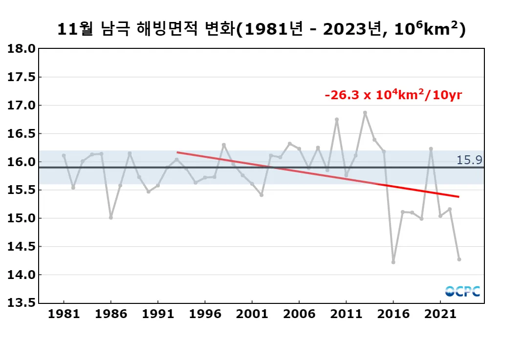 11월 남극 해빙면적은 1993~2023년 동안 10년에 26만km²씩 감소하는 추세입니다.