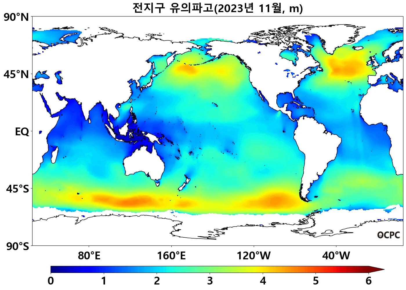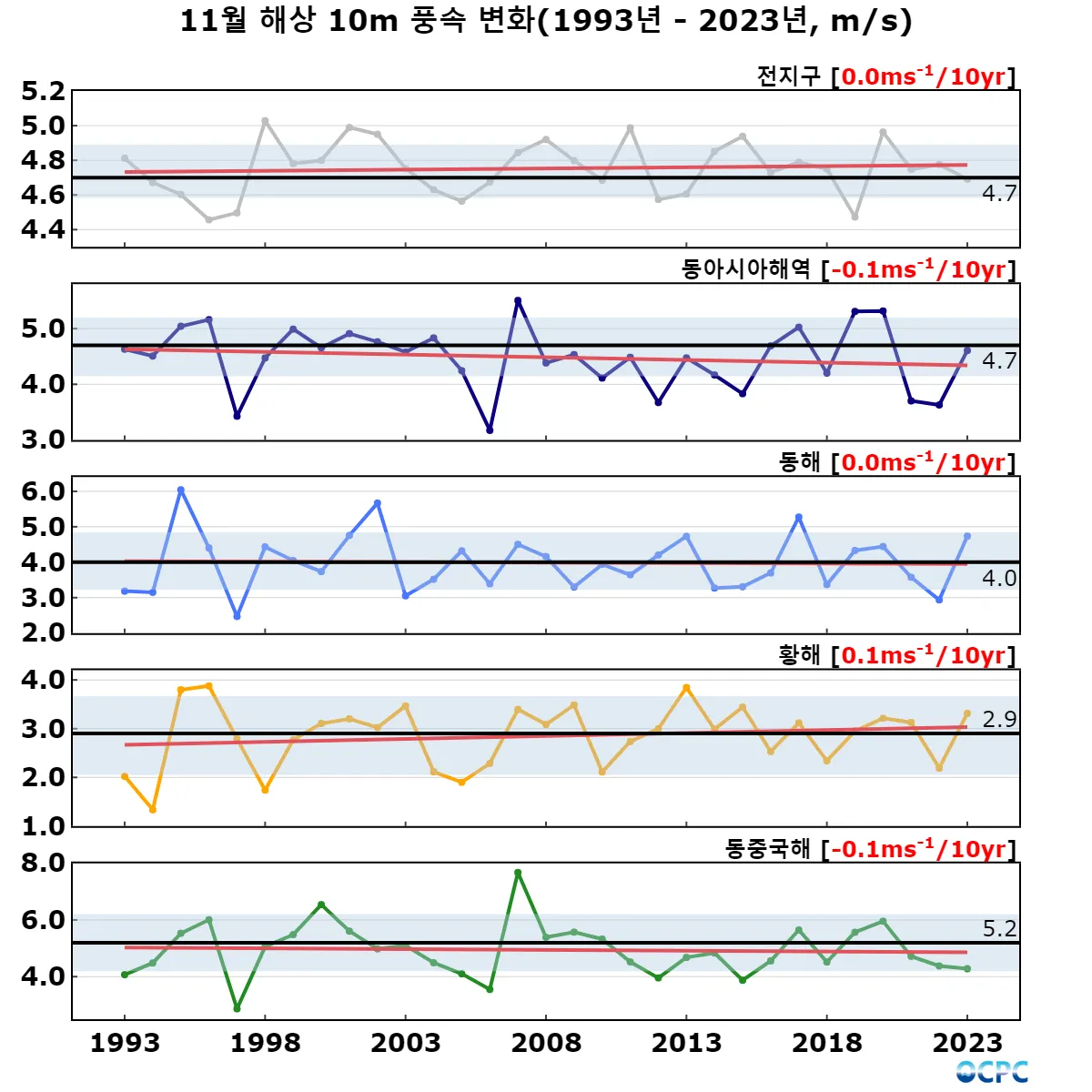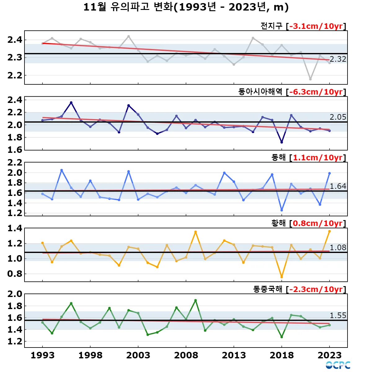 1993~2023년 동안 전지구, 동아시아해역의 11월 평균 유의파고는 10년에 각각 3.1cm, 6.3cm씩 감소하는 추세입니다.