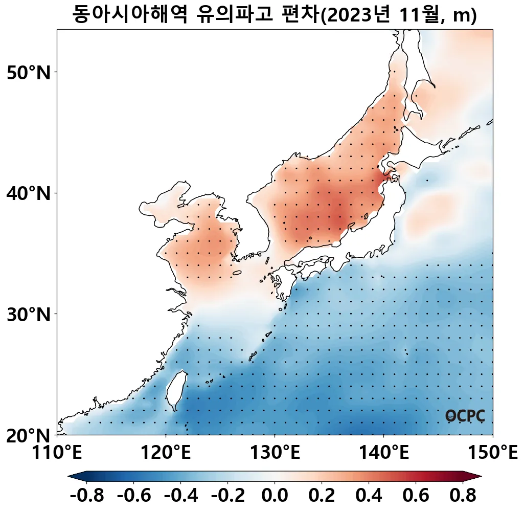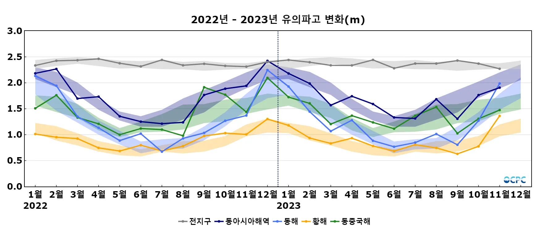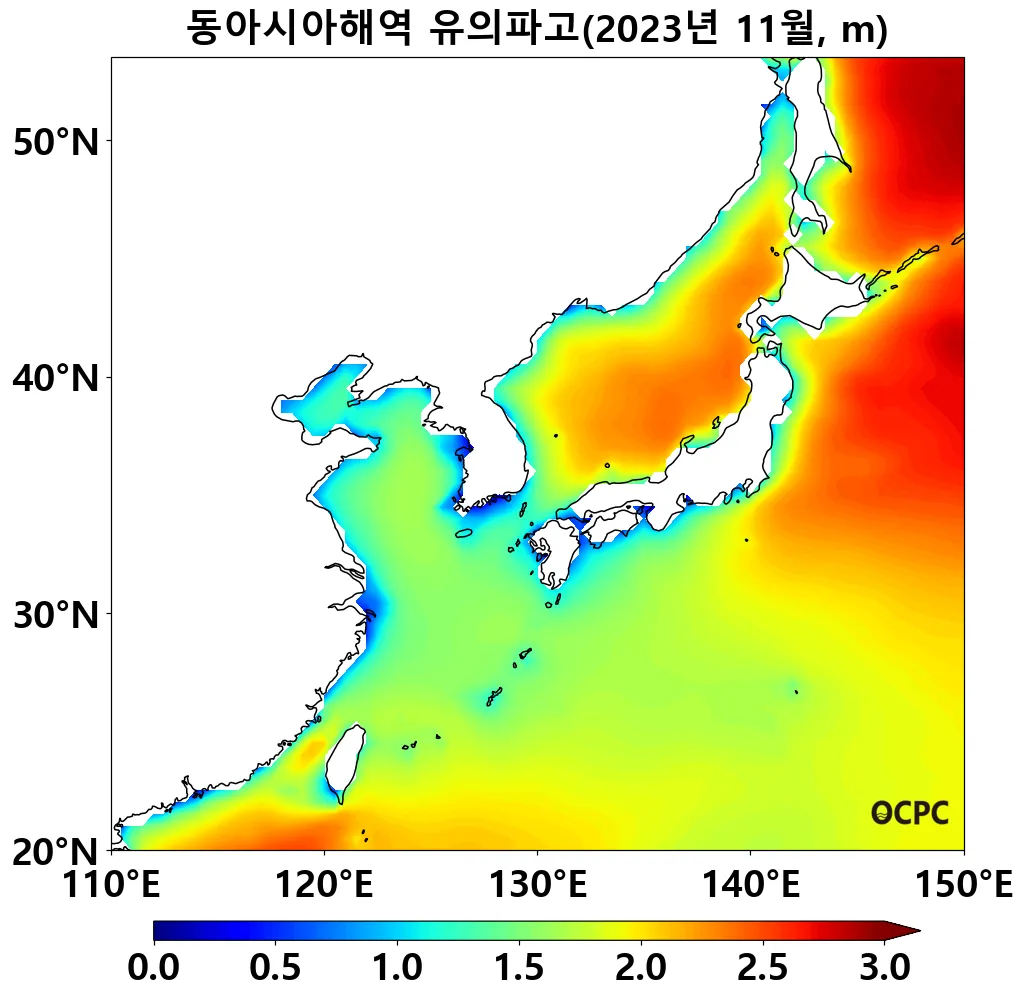 동해, 황해의 평균 유의파고는 평년(1.6±0.2m, 1.1±0.1m)보다 각각 0.4m, 0.3m씩 증가했으며, 동중국해는 평년(1.6±0.2m)과 비슷했습니다.