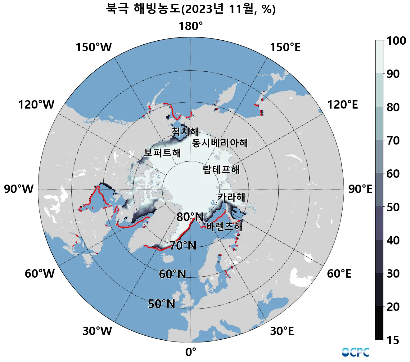 해빙농도 15% 이상 해역, 붉은선(평년 해빙농도 15% 경계)