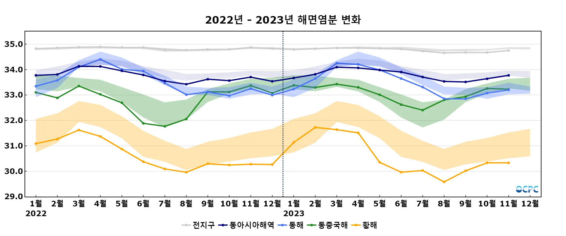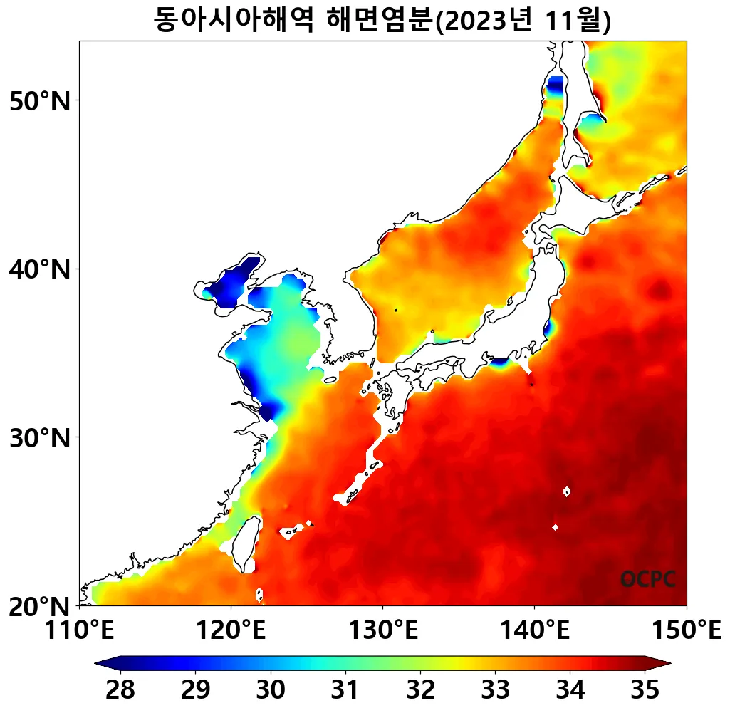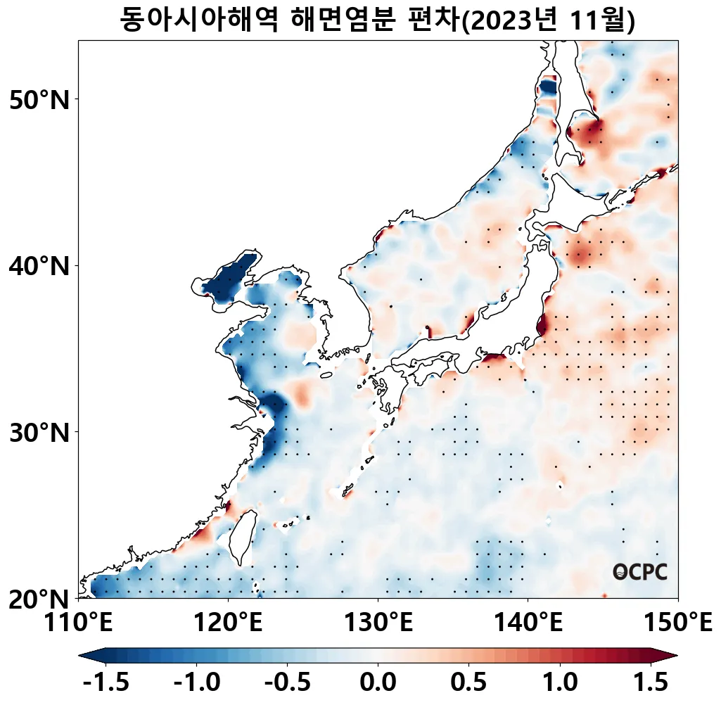 동아시아해역 해면염분은 자료기간 평균(33.9±0.1)보다 0.1 낮았습니다.