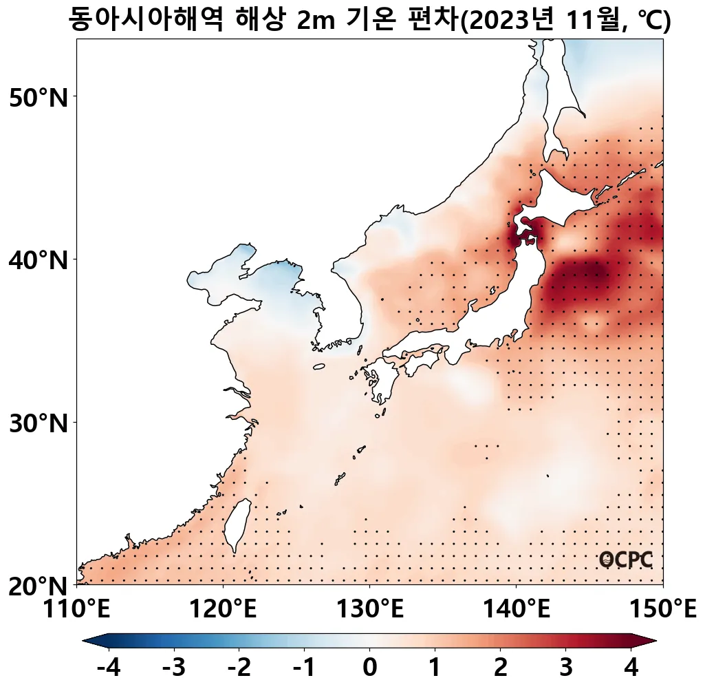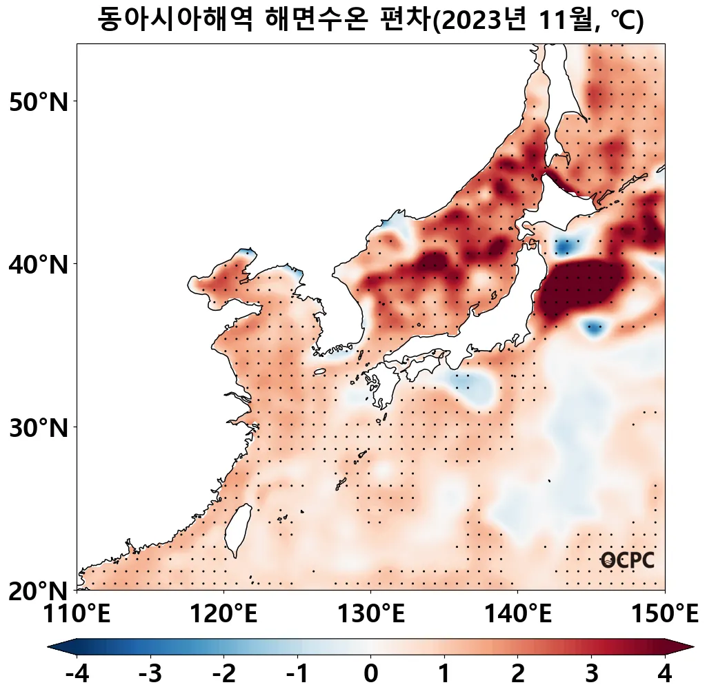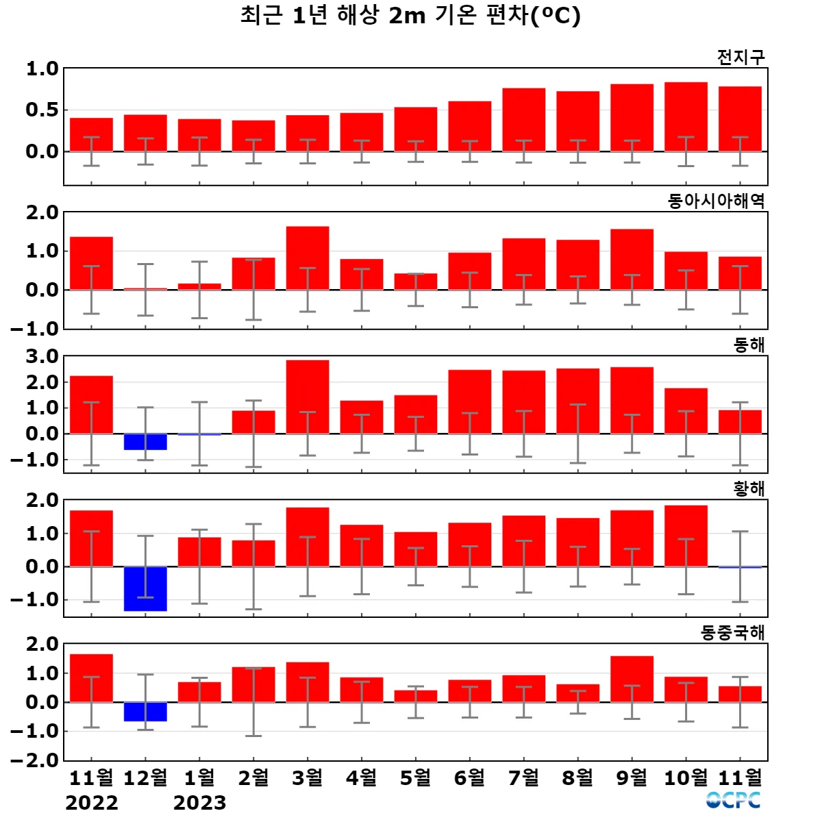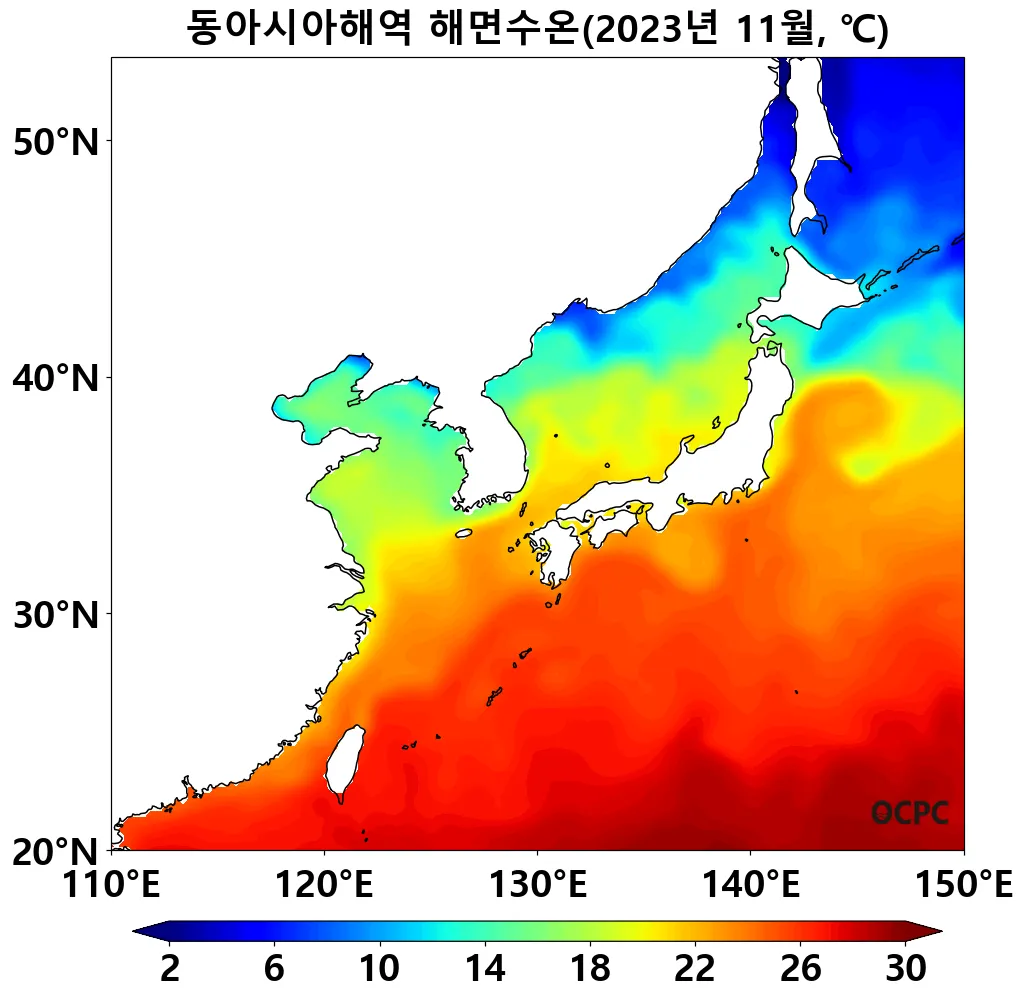 동해와 황해, 동중국해는 평년(13.2±0.5°C, 15.3±0.6°C, 22.7±0.5°C)보다 각각 2.0°C, 1.3°C, 0.8°C 높아 1982~2023년(11월) 중 상위 1위를 기록했습니다.
