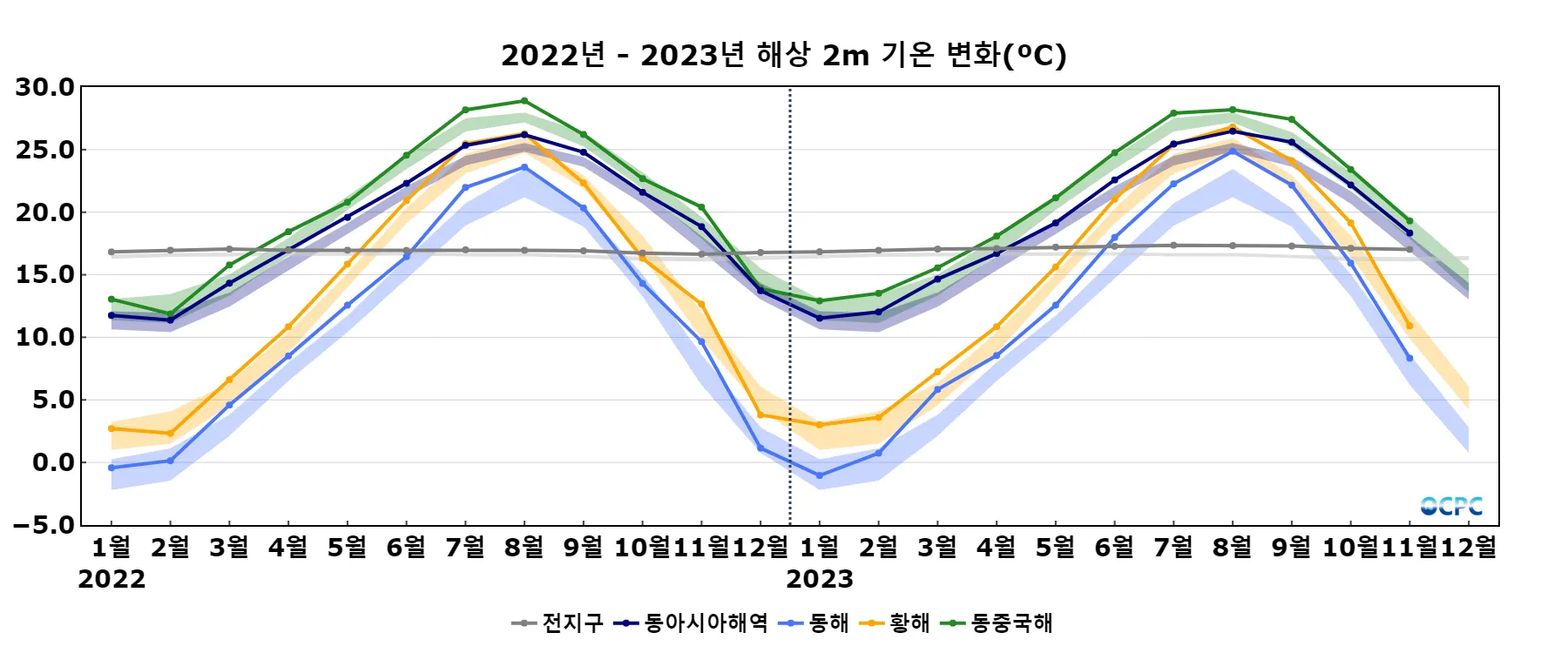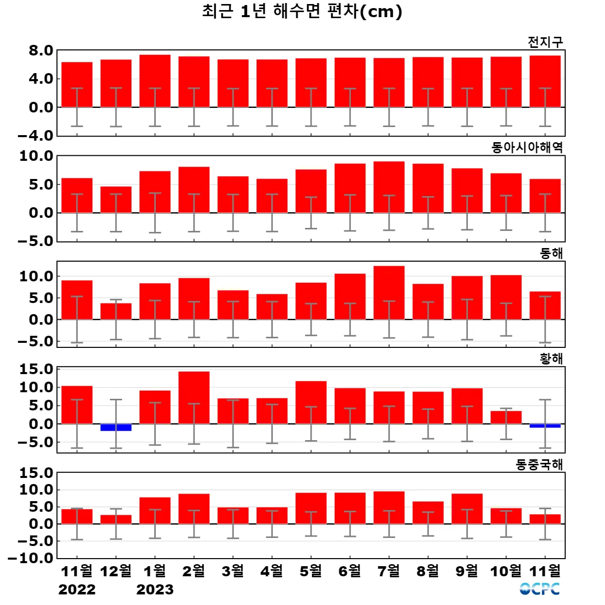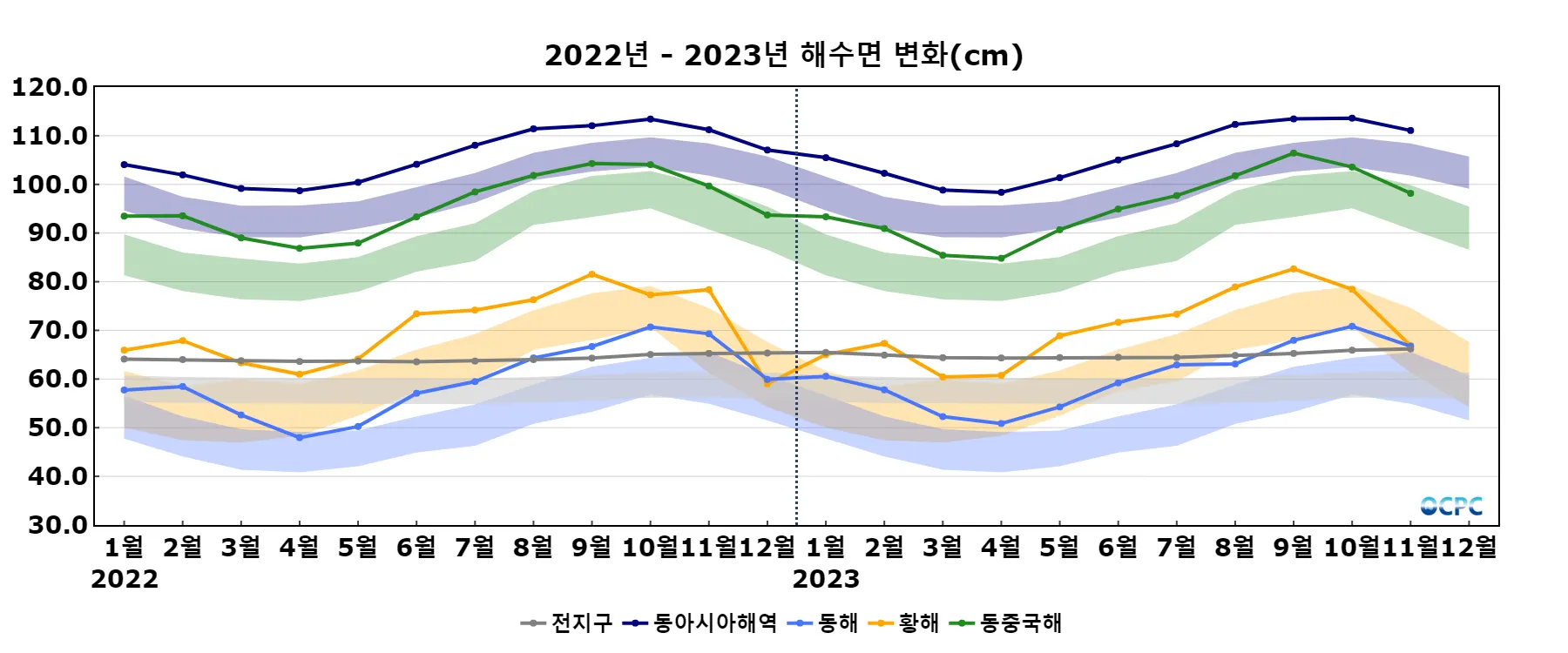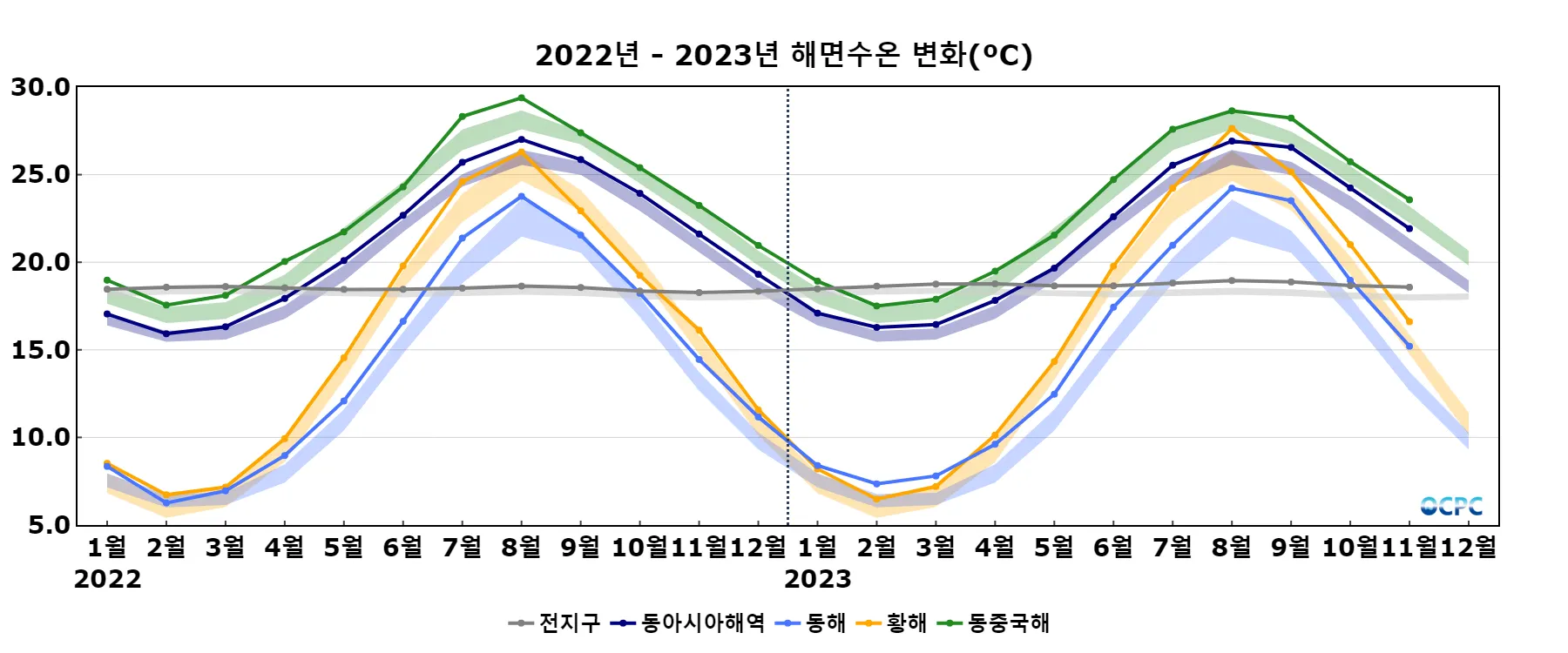 동해와 황해, 동중국해는 평년(13.2±0.5°C, 15.3±0.6°C, 22.7±0.5°C)보다 각각 2.0°C, 1.3°C, 0.8°C 높아 1982~2023년(11월) 중 상위 1위를 기록했습니다.