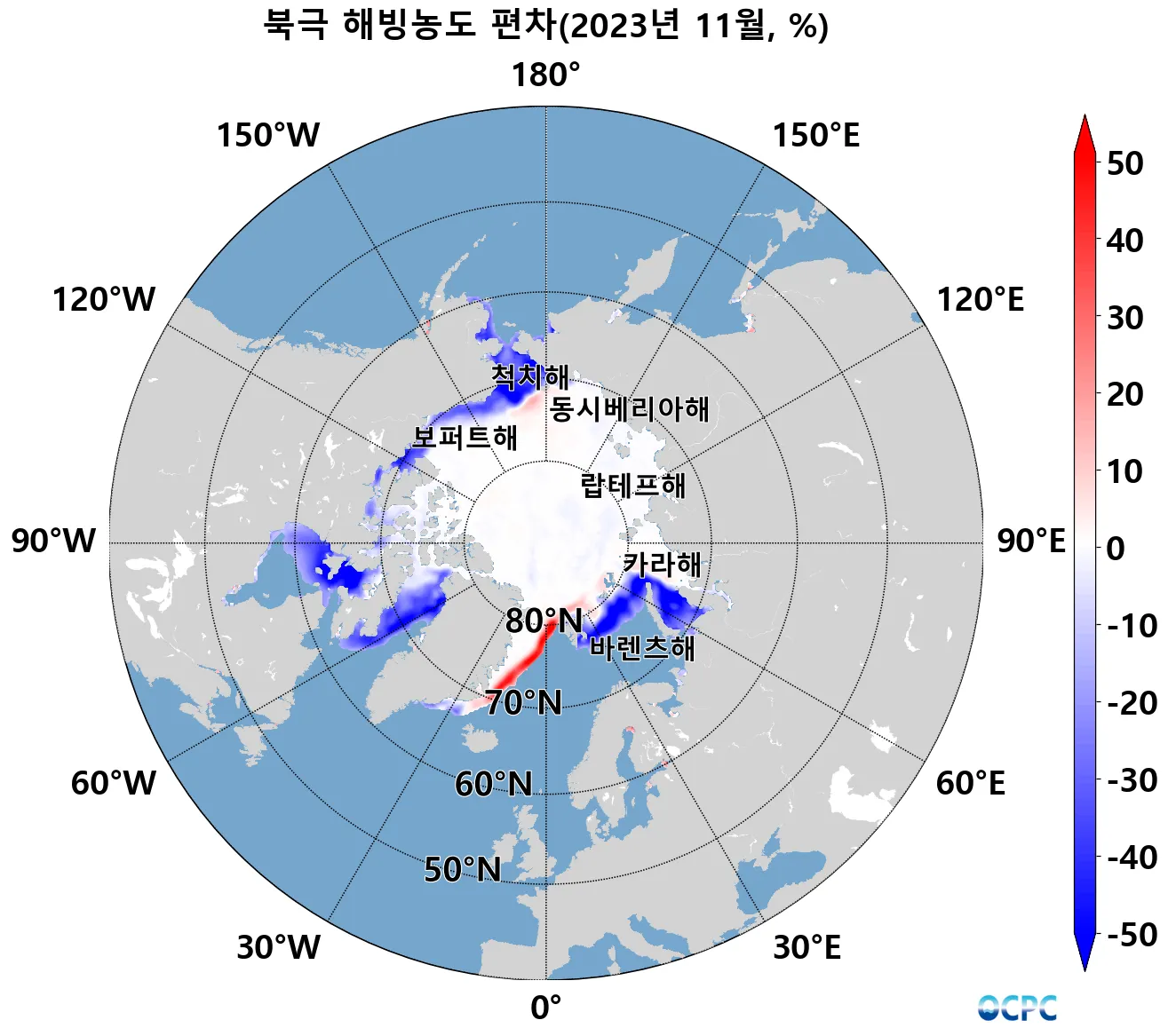 지난달에 비해 북극해빙면적은 빠르게 평년수준으로 증가하는 경향을 보이지만, 11월말 해빙증가 속도의 둔화가 보고 되었으며, 바렌츠-카라해, 척치해의 평년대비 해빙 감소가 두드러지게 나타났습니다.