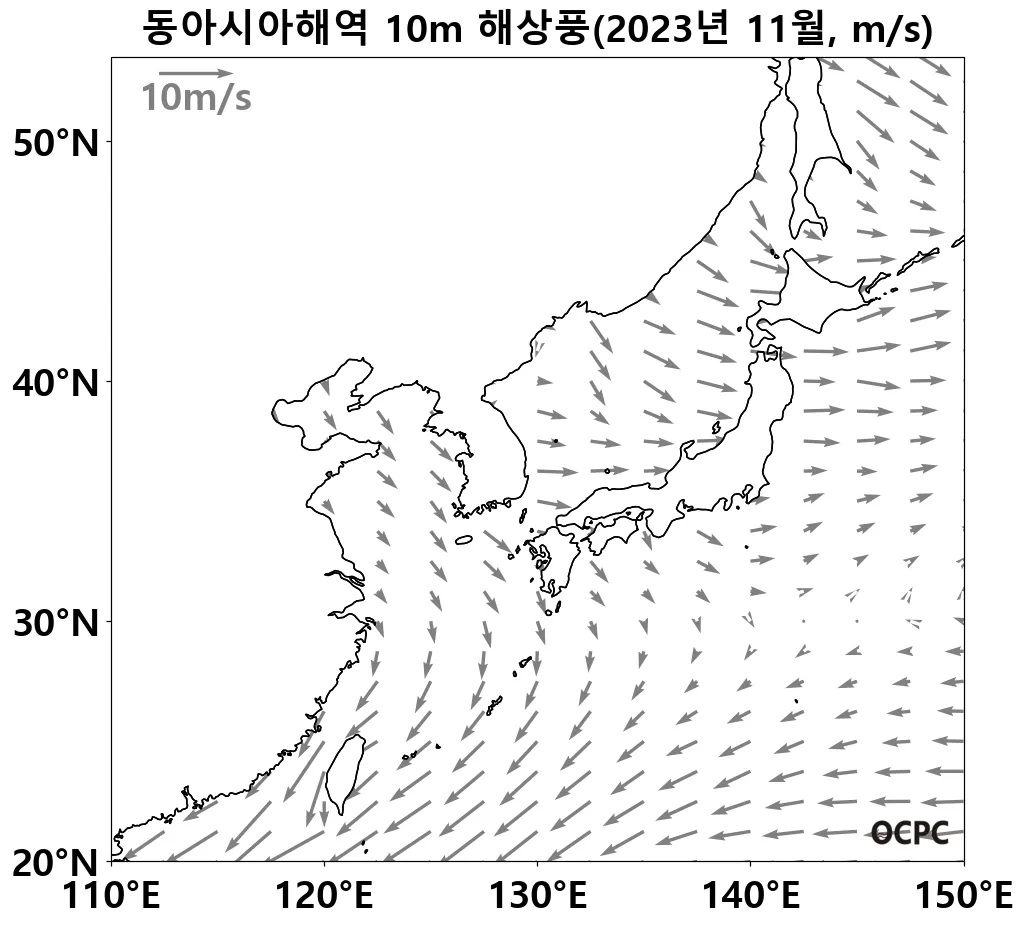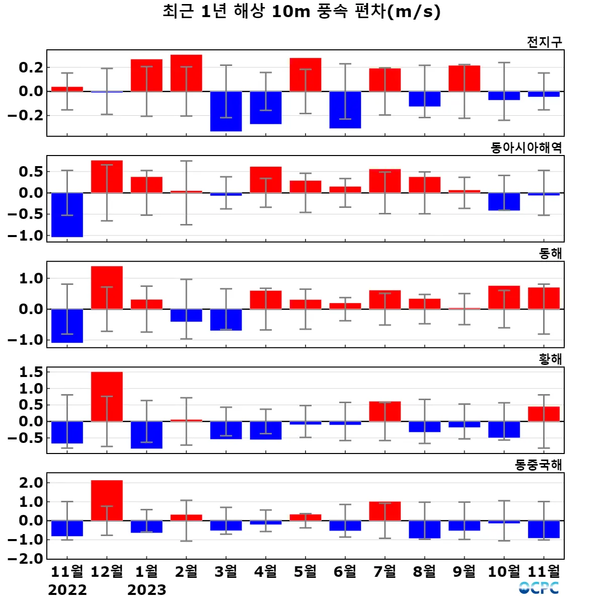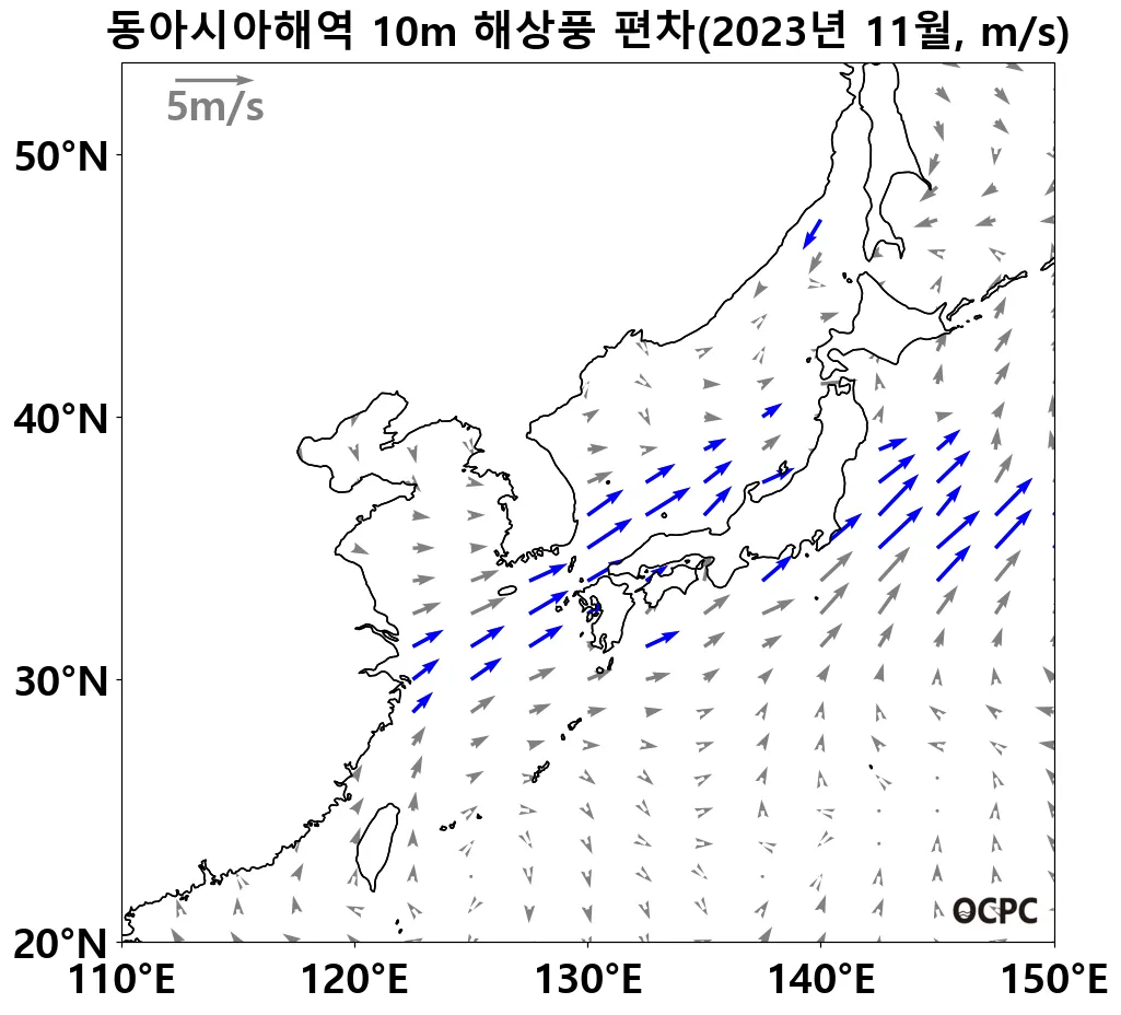 동해, 황해, 동중국해의 해상풍속은 평년(4.0±0.8m/s, 2.9±0.8m/s, 5.2±1.0m/s)과 비슷했습니다.