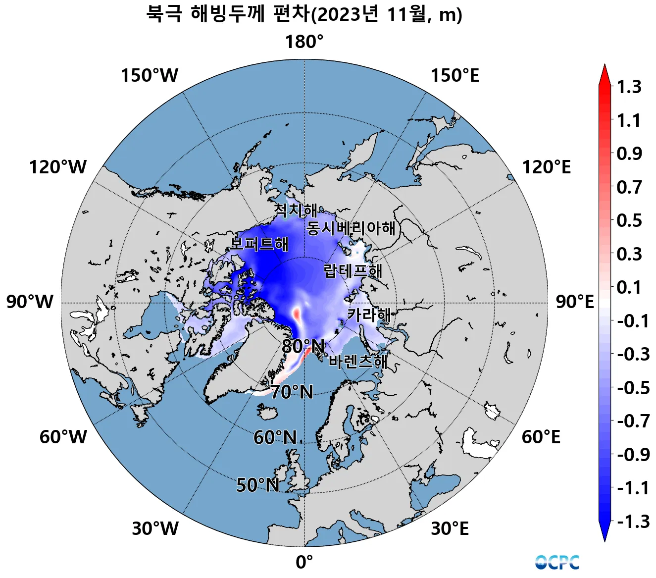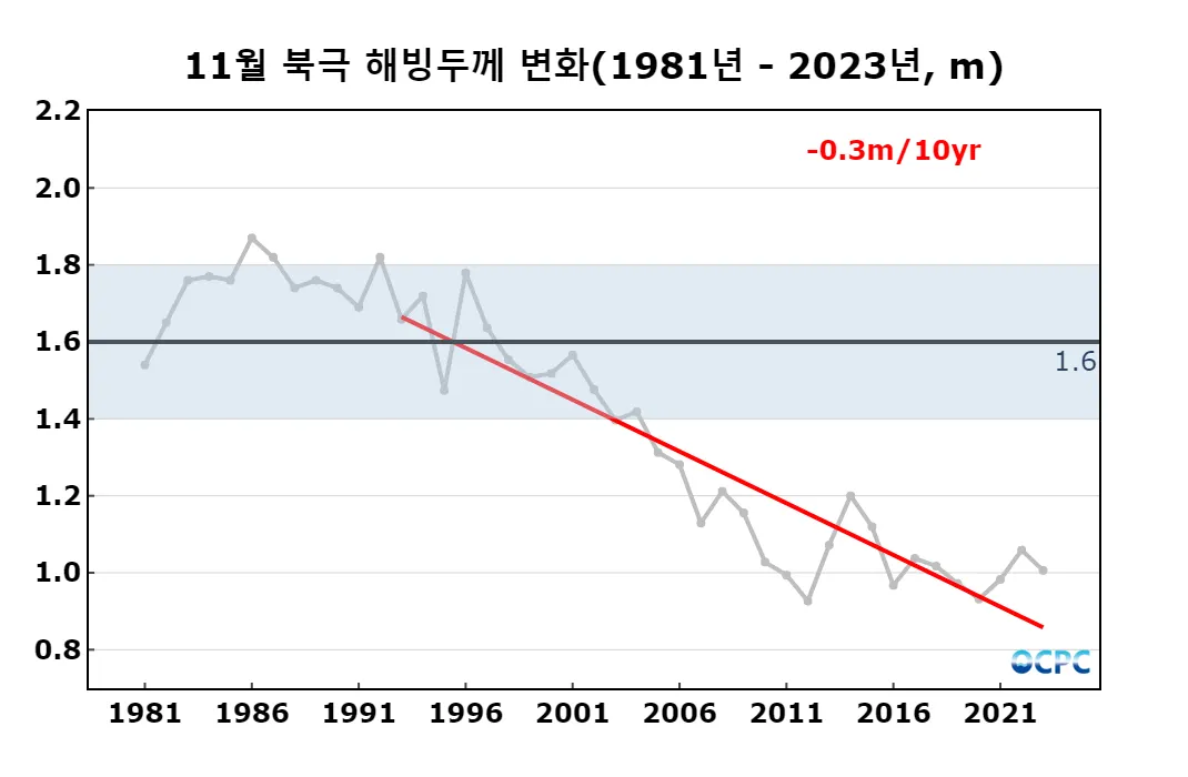 11월 북극 해빙두께는 1.1m로 평년(1.6±0.3m) 보다 약 0.5m(32.9%) 감소했으며, 1993~2023년 동안 10년에 0.3m씩 감소하는 추세입니다.