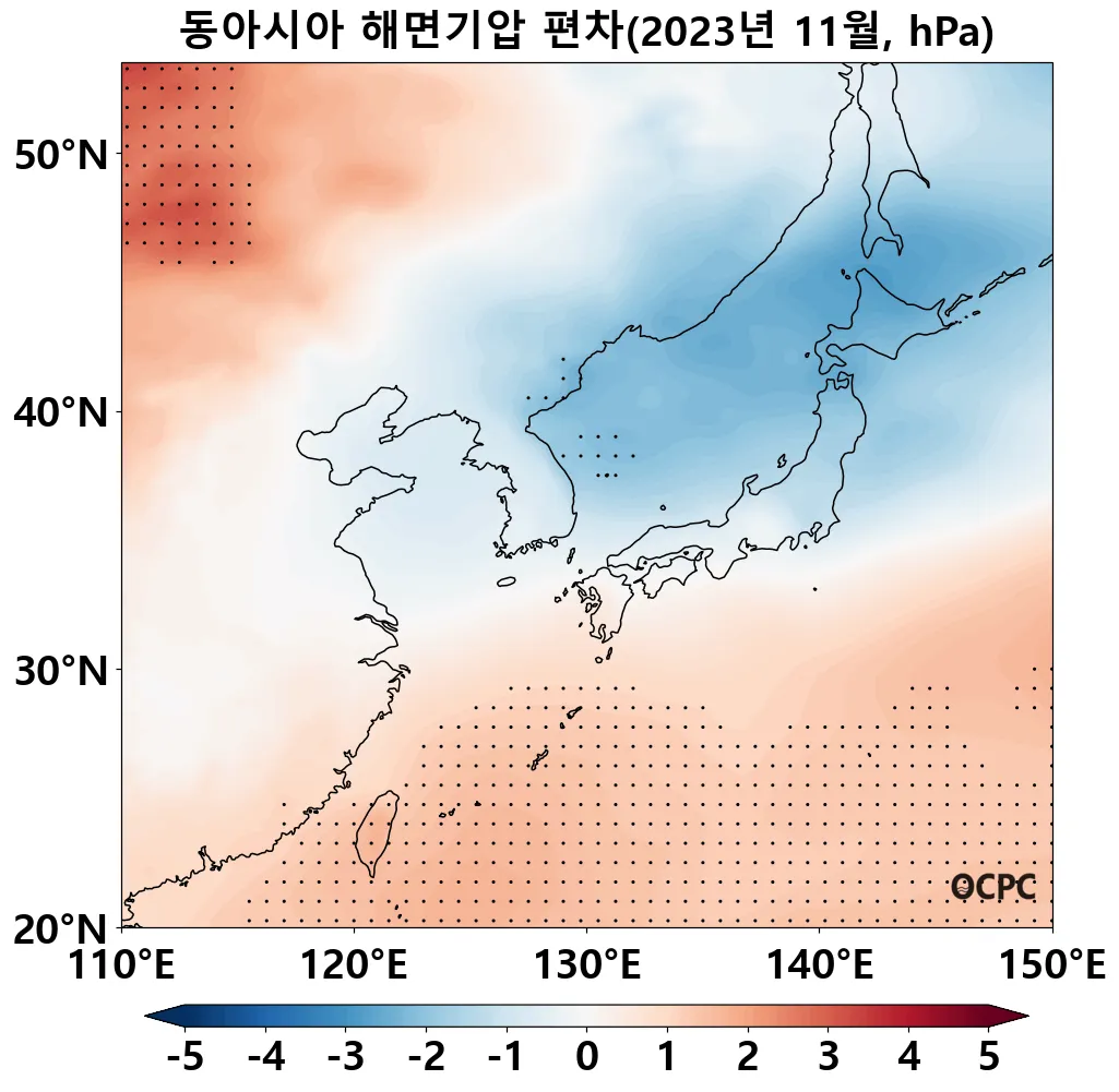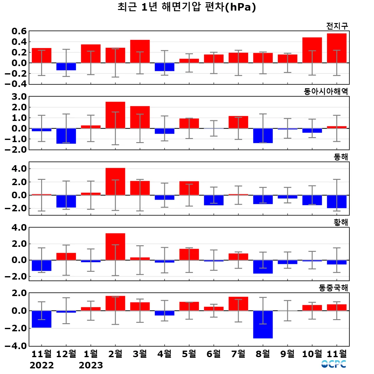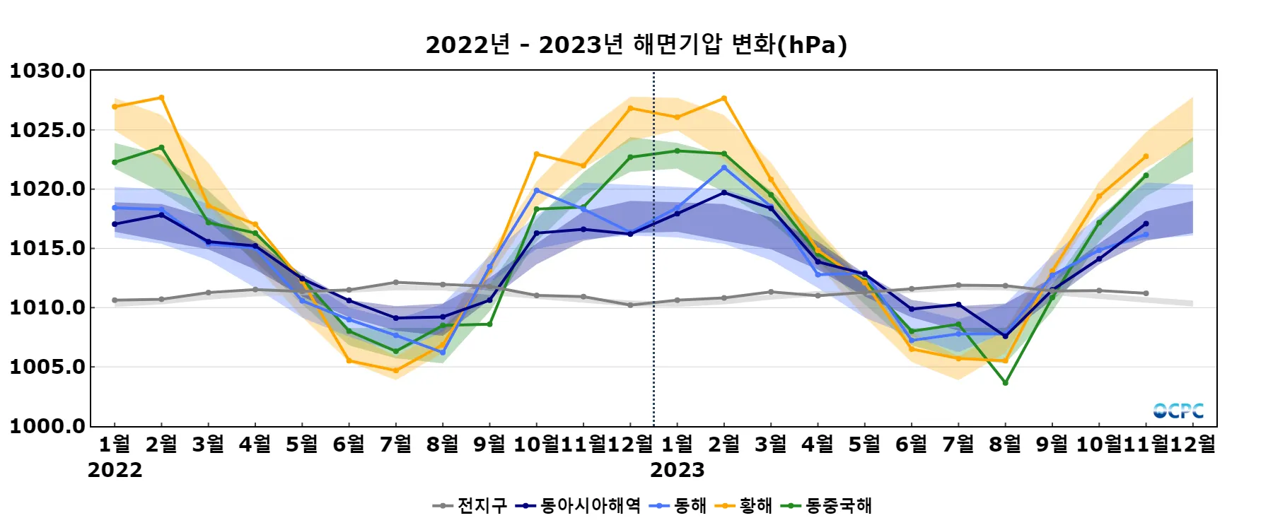 동해, 황해, 동중국해의 해면기압은 평년(1018.2±2.4hPa, 1023.3±1.5hPa, 1020.4±1.0hPa)과 비슷했습니다.