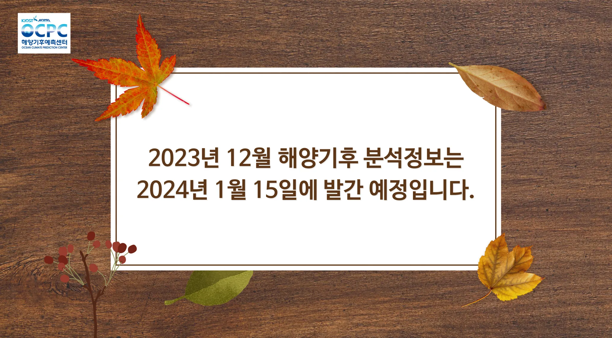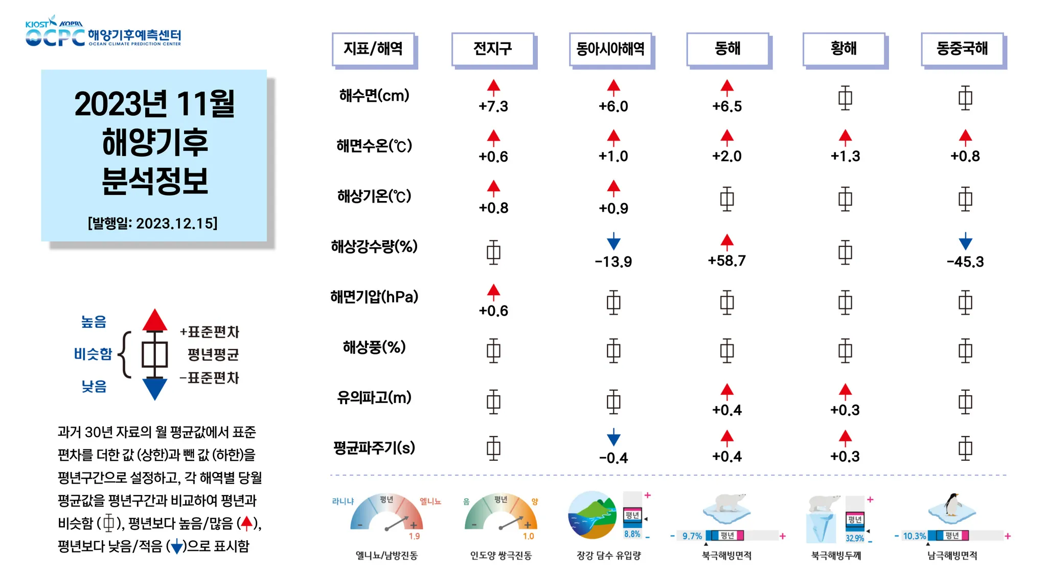 요약 : 전지구 해수면, 해면수온, 해상기온은 역대 11월 중 가장 높았으며, 동해, 쿠로시오확장역의 고수온이 계속 유지되고 있습니다. 열대 태평양에서 엘니뇨가 강하게 발달하고 있으며, 북극 바렌츠해와 척치해의 해빙농도의 감소가 두드러졌고, 남극 해빙 면적은 역대 11월 중 두번째로 가장 작았습니다.