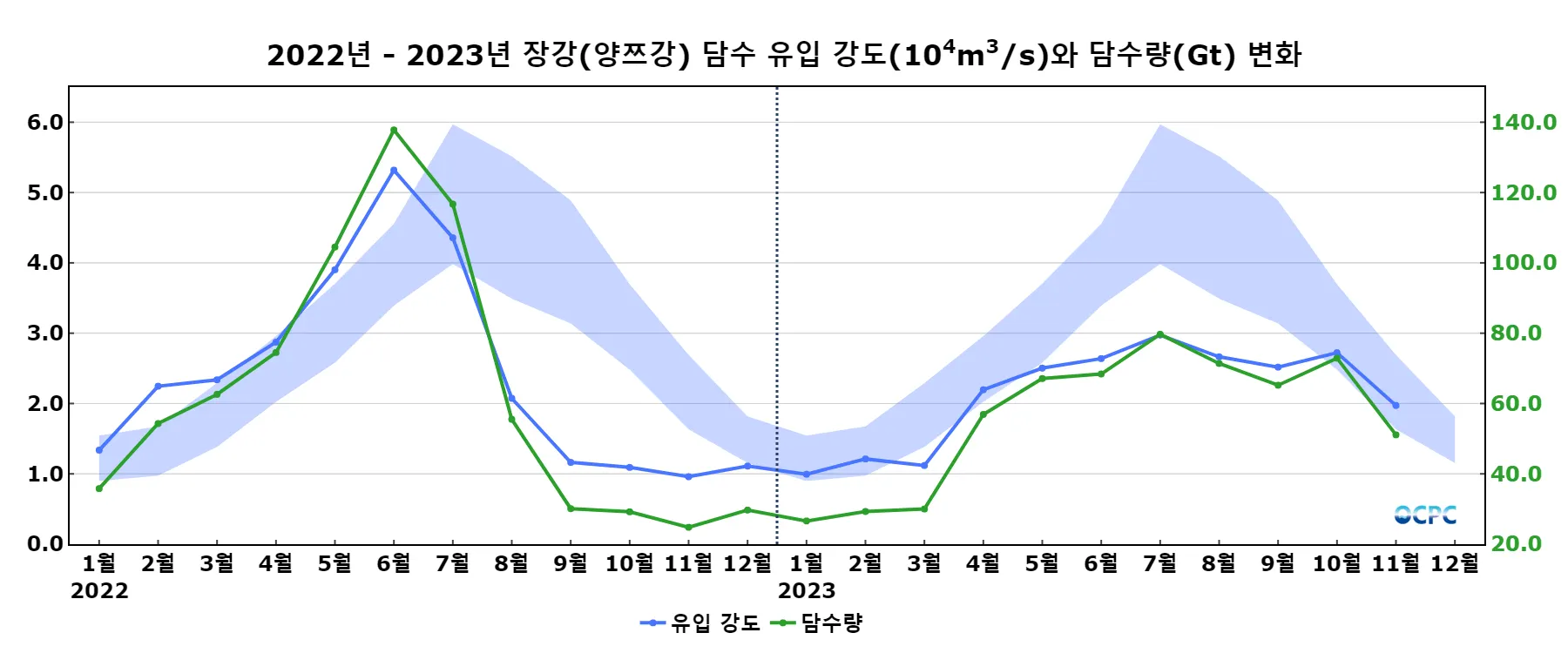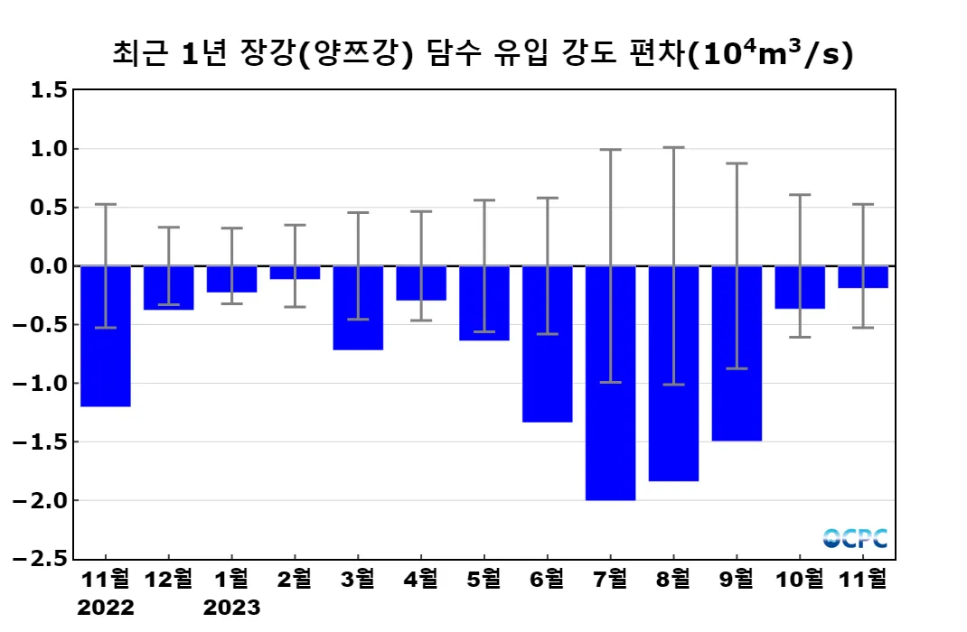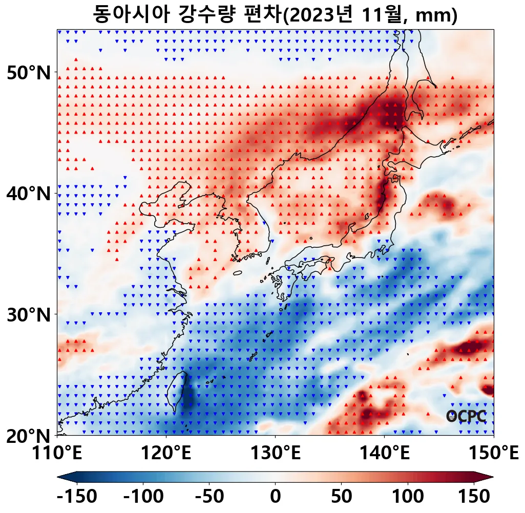 11월 한 달 동안 동중국해로 유입된 담수량으로 환산하면, 51.1기가톤(1Gt=10⁹m³=1km³)으로 평년(56.1±13.7기가톤)과 비슷했습니다.